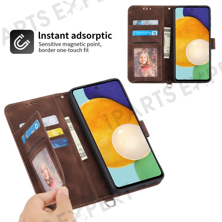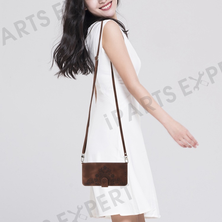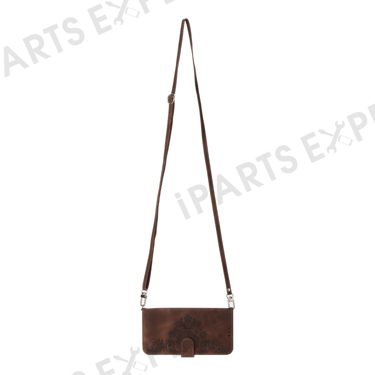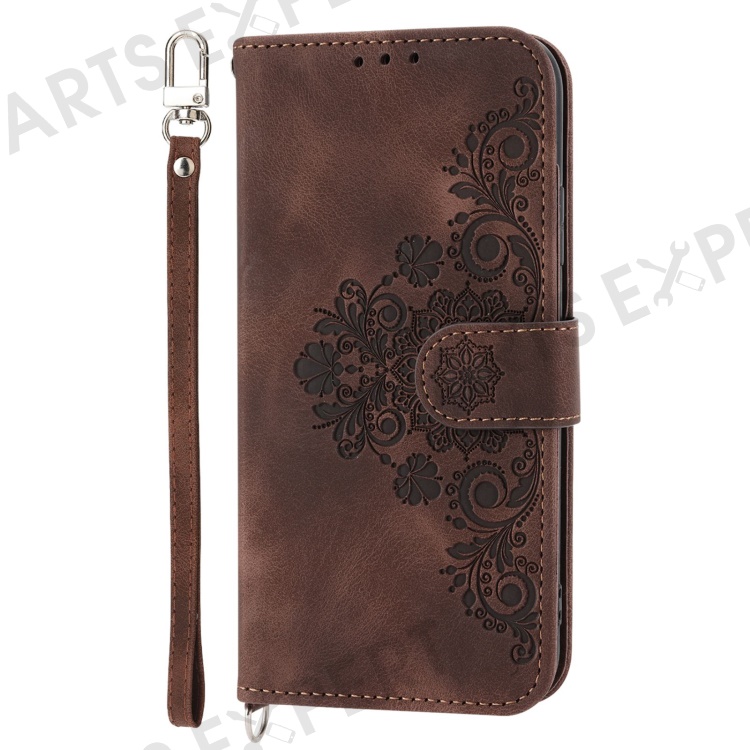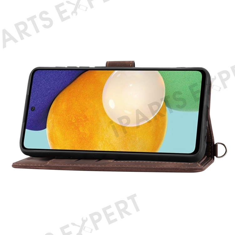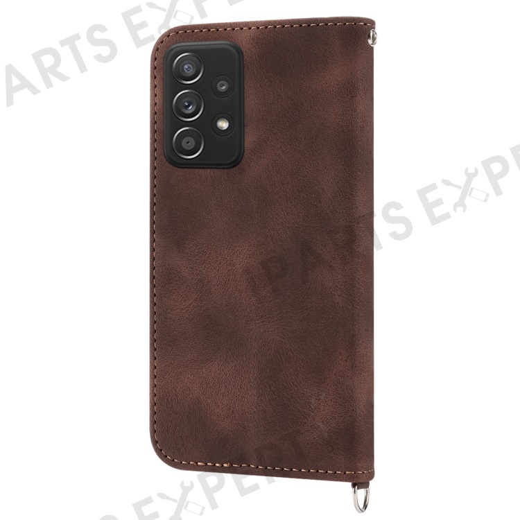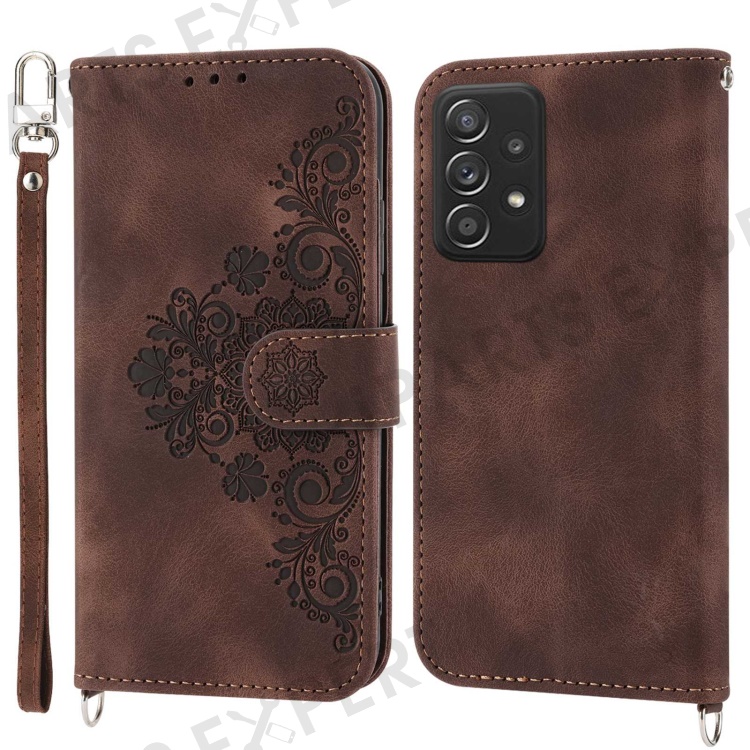 For Samsung Galaxy A52 4G / A52 5G / A52s 5G Imprinted Flowers PU Leather Flip Case Stand Multiple Card Slots Skin-touch Cover with Wrist Strap and Shoulder Strap - Brown