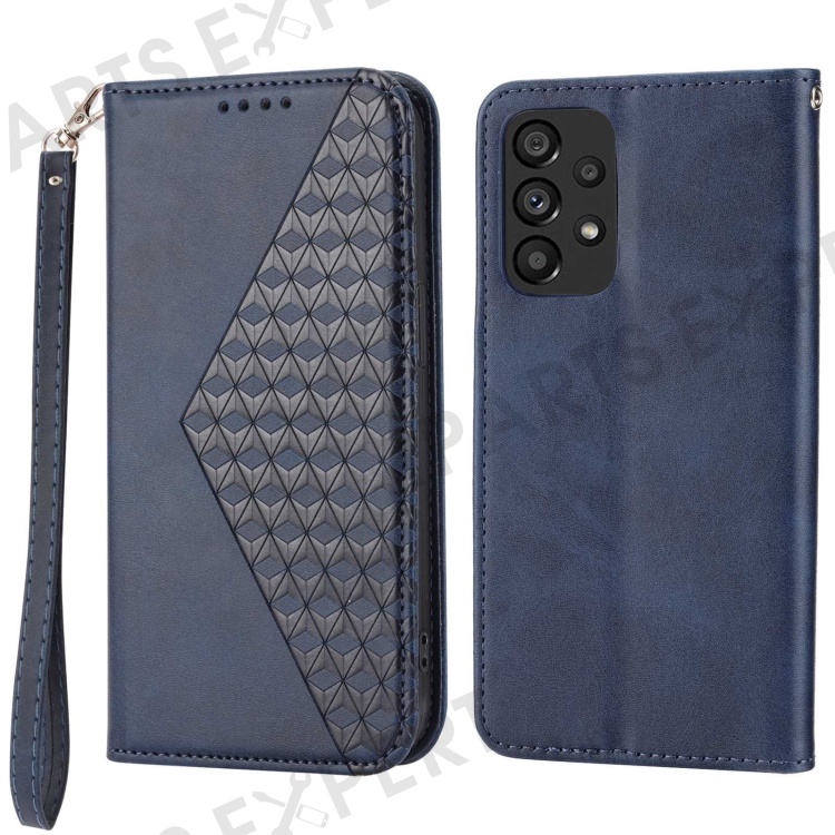 For Samsung Galaxy A53 5G Calf Texture Imprinted Rhombus Pattern PU Leather Shockproof Cover Wallet Stand Phone Case with Strap - Blue
