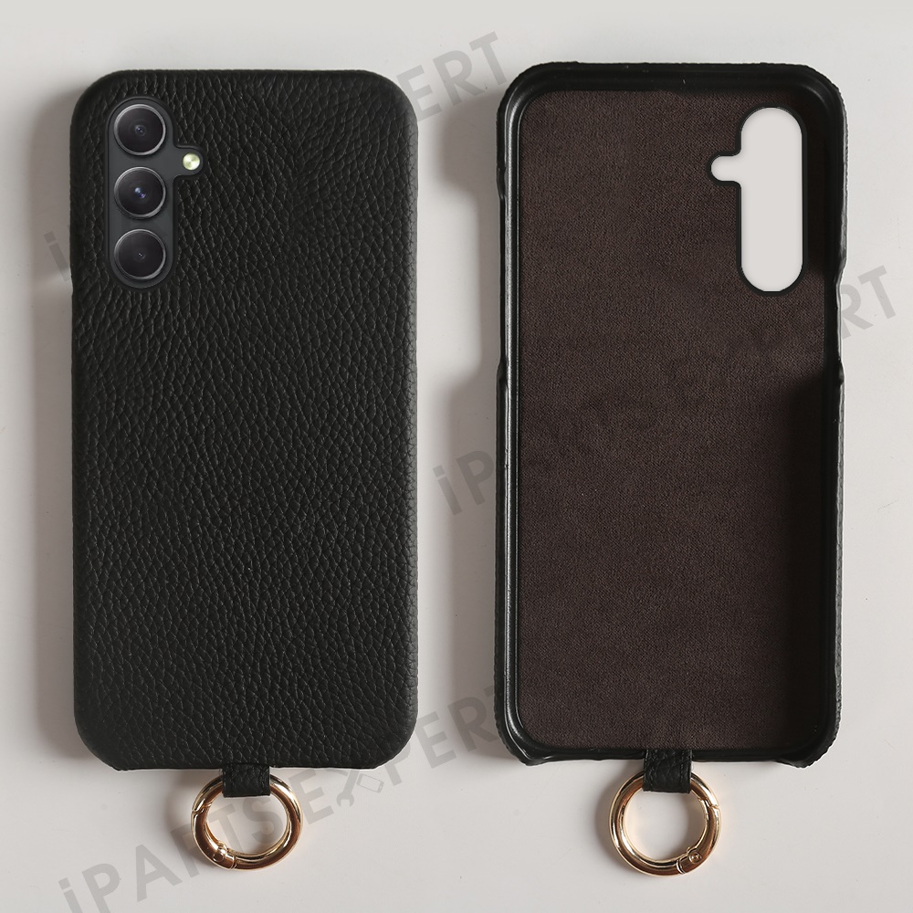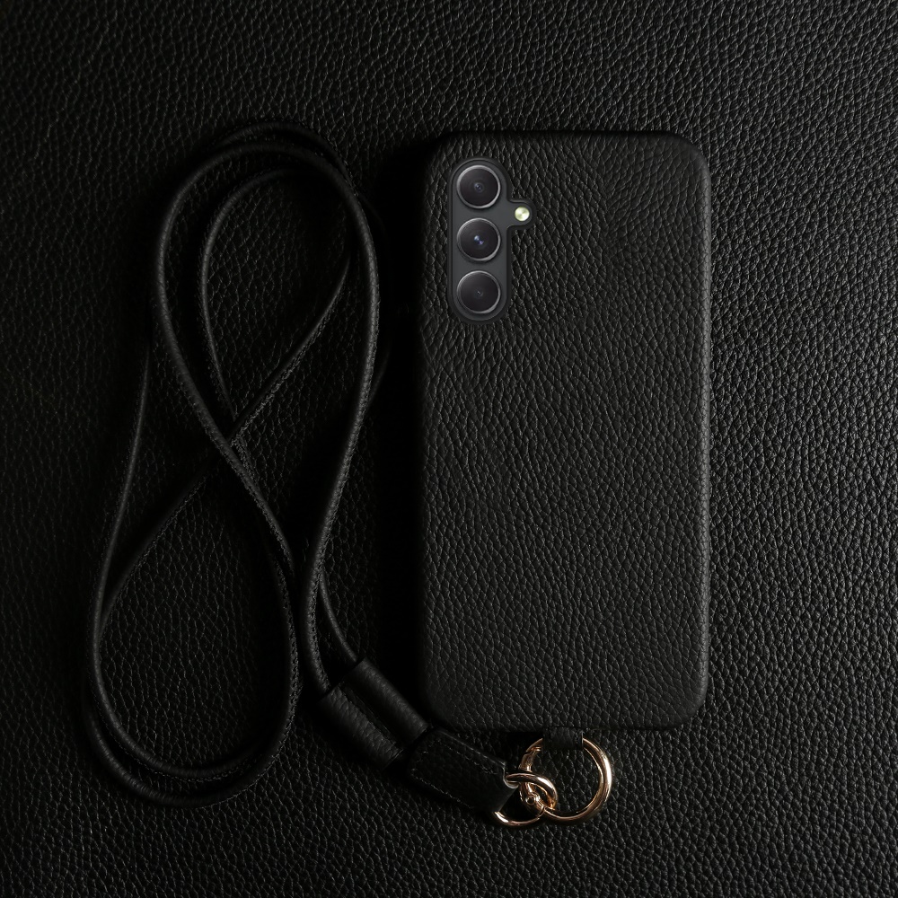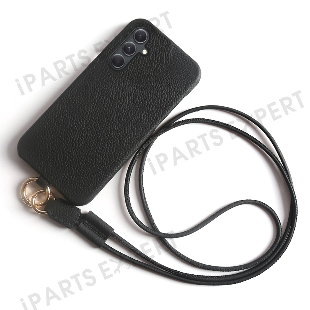 For Samsung Galaxy A54 5G Case with Lanyard Genuine Cow Leather PC Phone Back Cover - Black