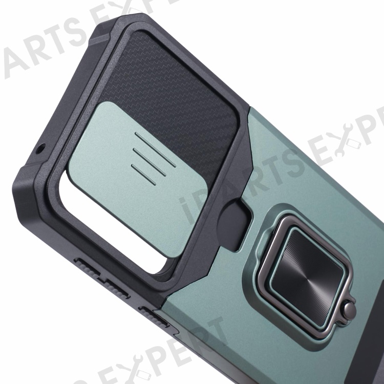 For Samsung Galaxy A55 5G Case PC+TPU Card Holder Phone Kickstand Cover with Slide Lens Lid - Blackish Green