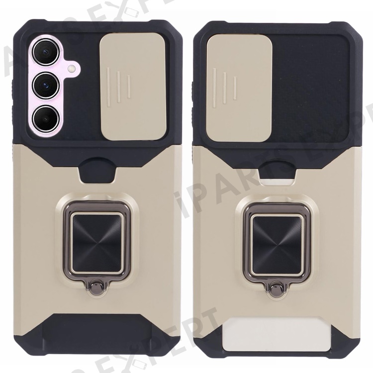 For Samsung Galaxy A55 5G Case PC+TPU Card Holder Phone Kickstand Cover with Slide Lens Lid - Gold
