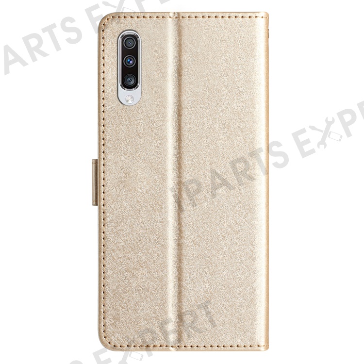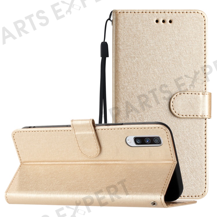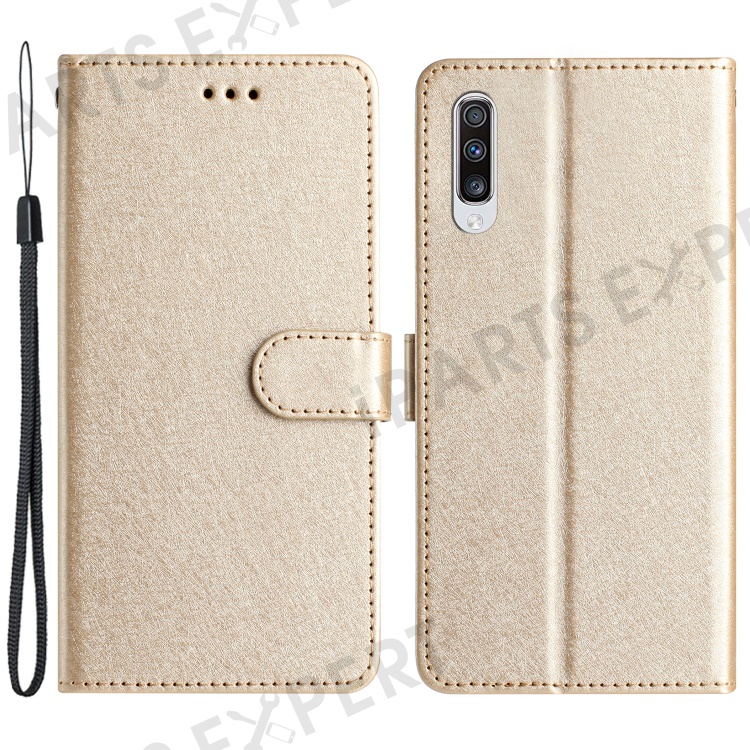 For Samsung Galaxy A70 / A70s Silk Texture PU Leather Wallet Stand Cell Phone Flip Case with Hand Strap - Gold