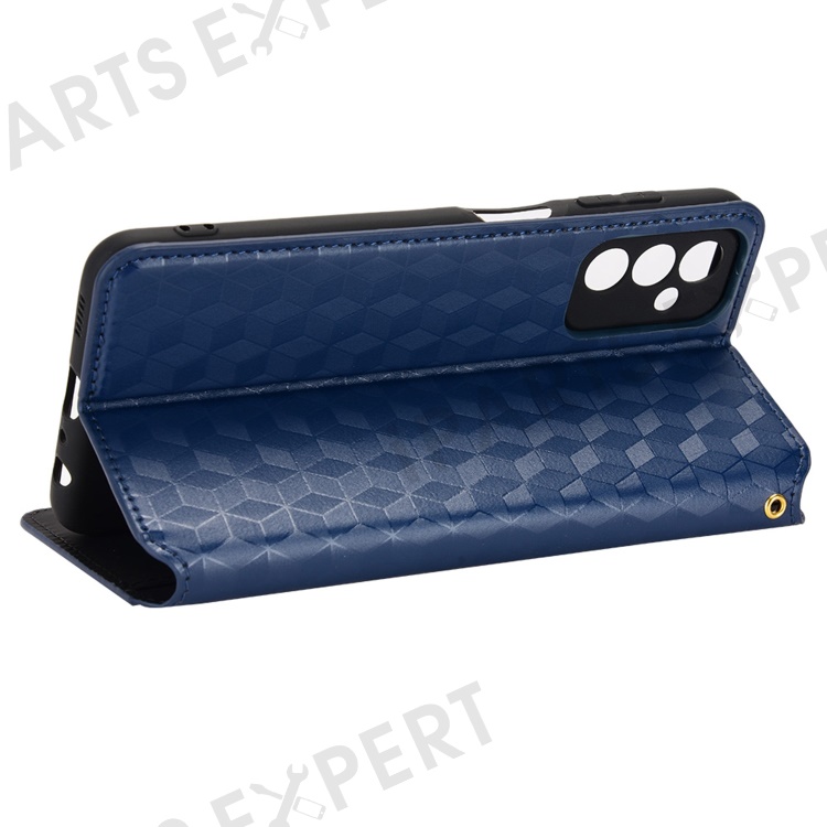 For Samsung Galaxy M13 4G Imprinting Rhombus Pattern PU Leather Cover Magnetic Auto-absorbed Phone Stand Wallet Case - Blue