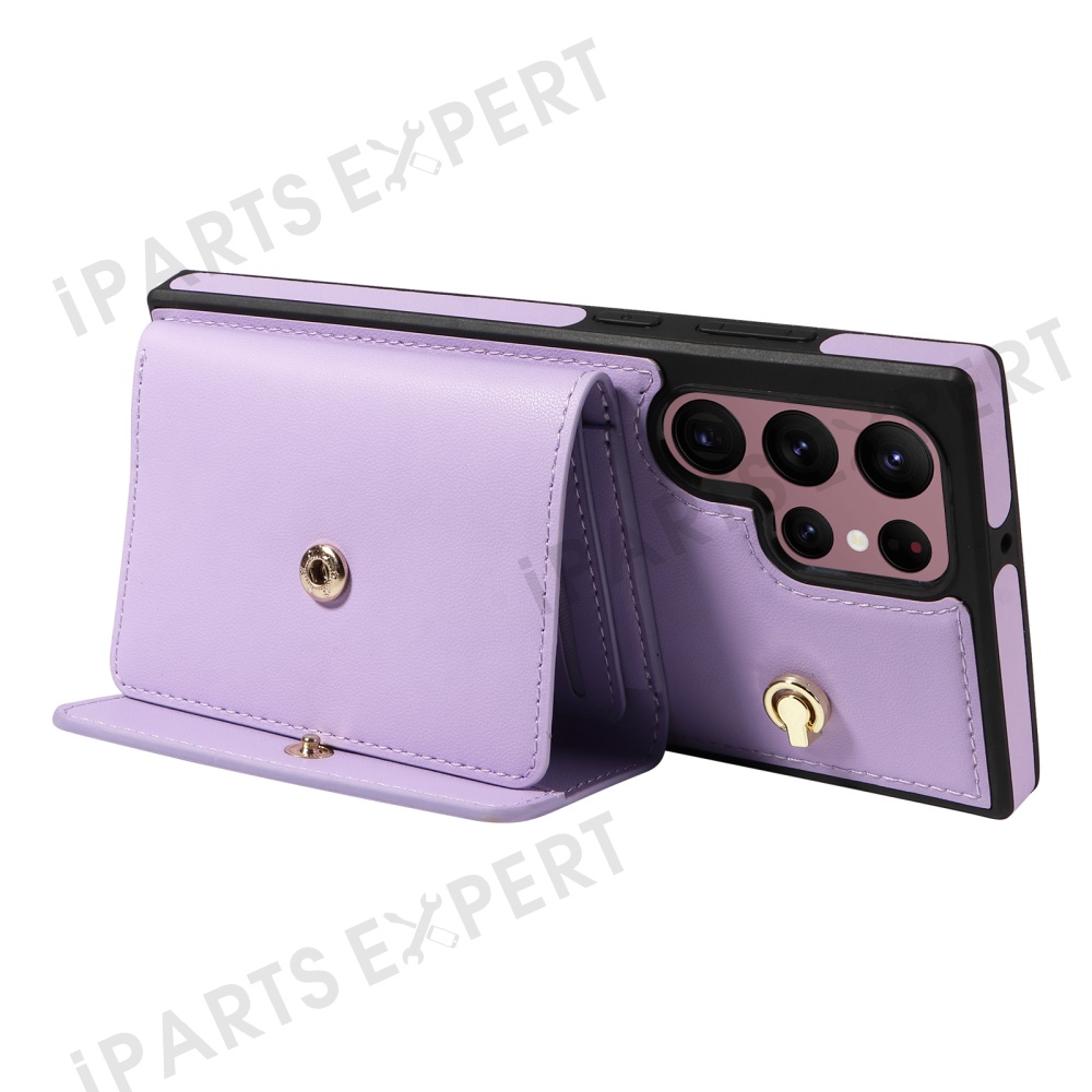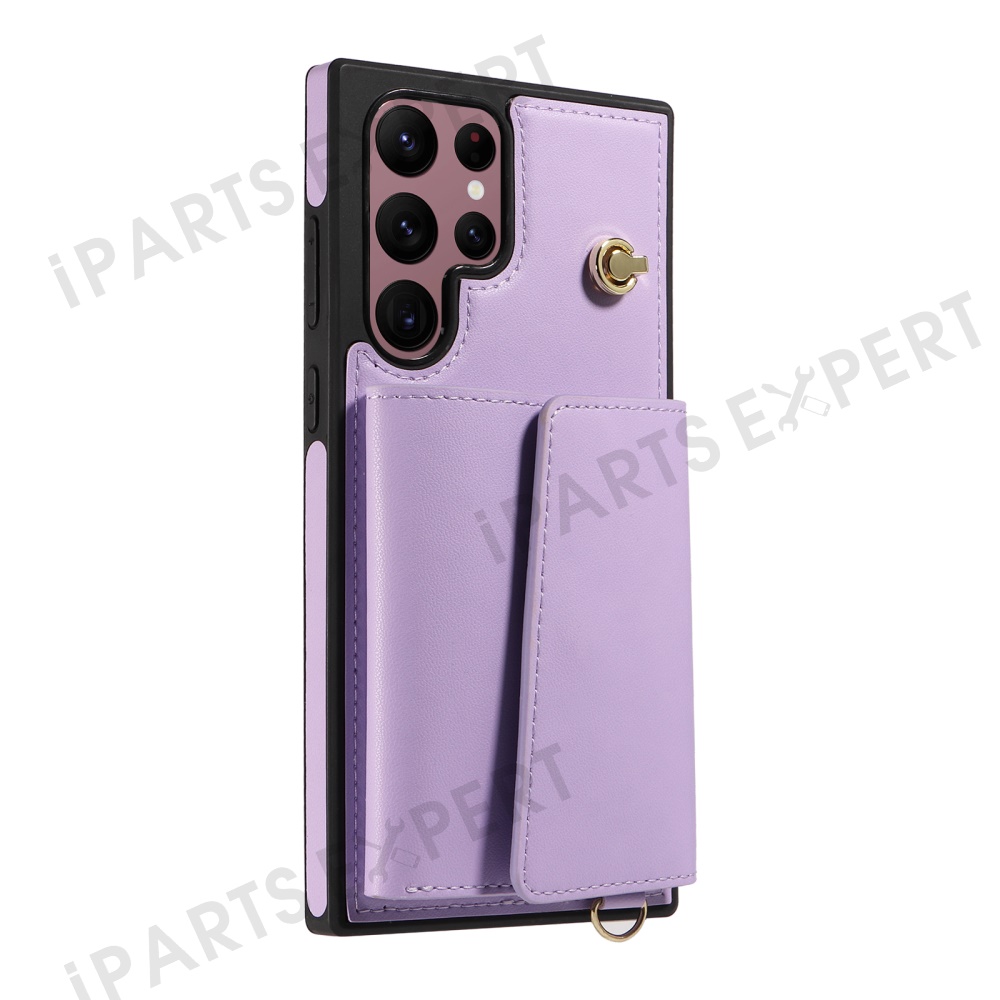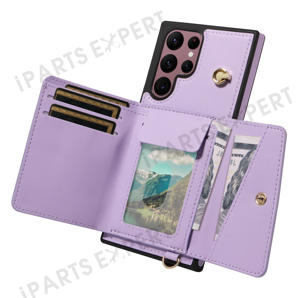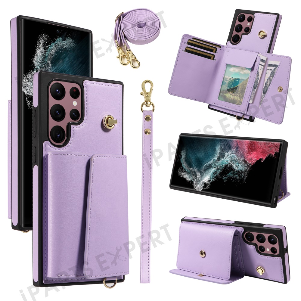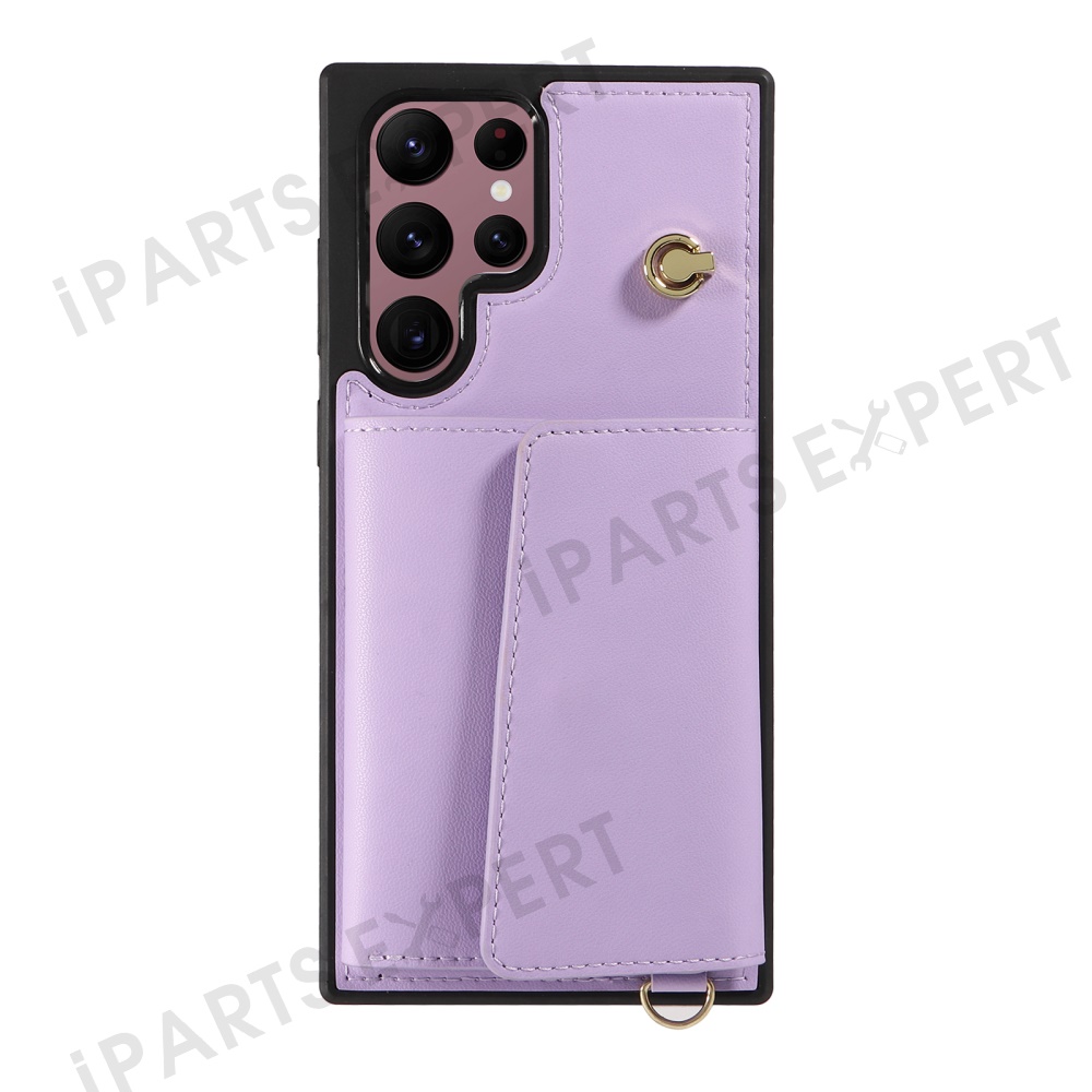 For Samsung Galaxy S22 Ultra 5G Crossbody Phone Case Card Holder Kickstand Leather Coated TPU Mobile Cover - Purple