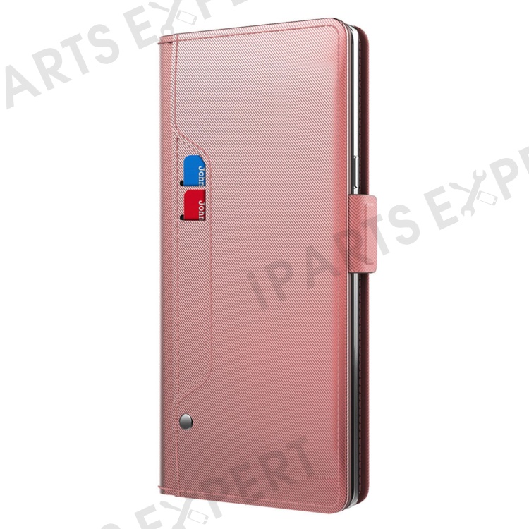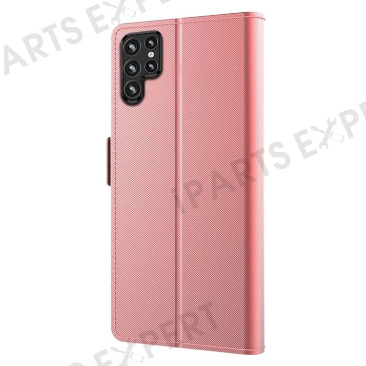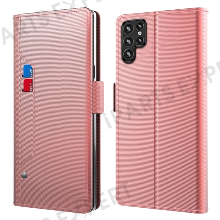 For Samsung Galaxy S22 Ultra 5G PU Leather Smartphone Case Card Holder Stand Dual Magnetic Clasp Anti-drop Protective Cell Phone Cover with Makeup Mirror - Rose Gold
