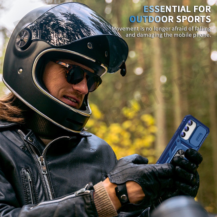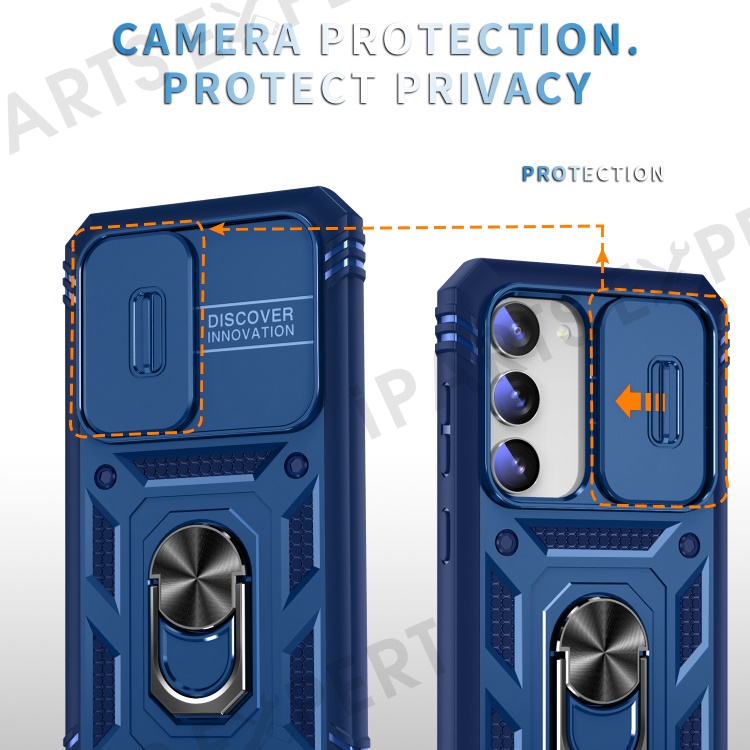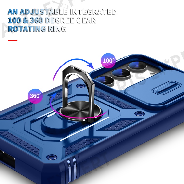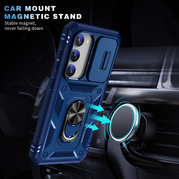 For Samsung Galaxy S23 Bump Proof Phone Case with Ring Kickstand Card Holder Phone Back Cover with Sliding Camera Lid - Blue
