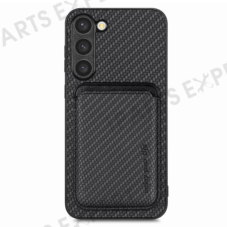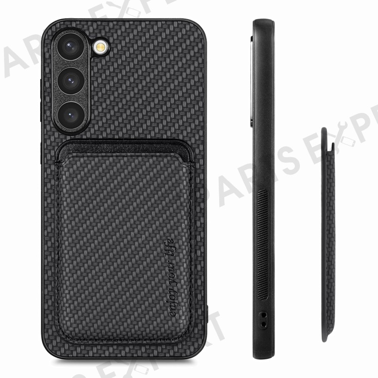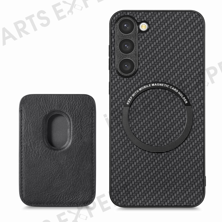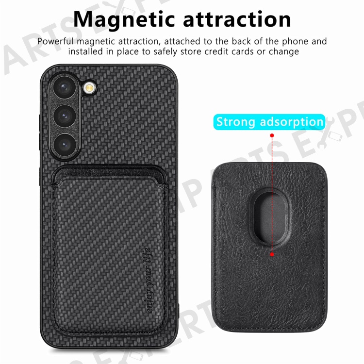 For Samsung Galaxy S23 Carbon Fiber Texture PU Leather + TPU + PVC Phone Case with Magnetic Detachable Card Holder - Black