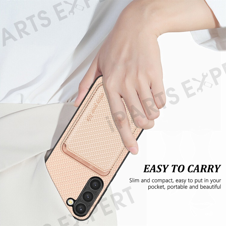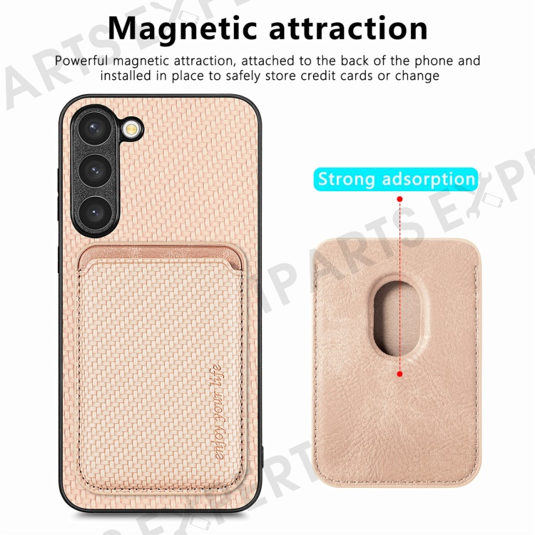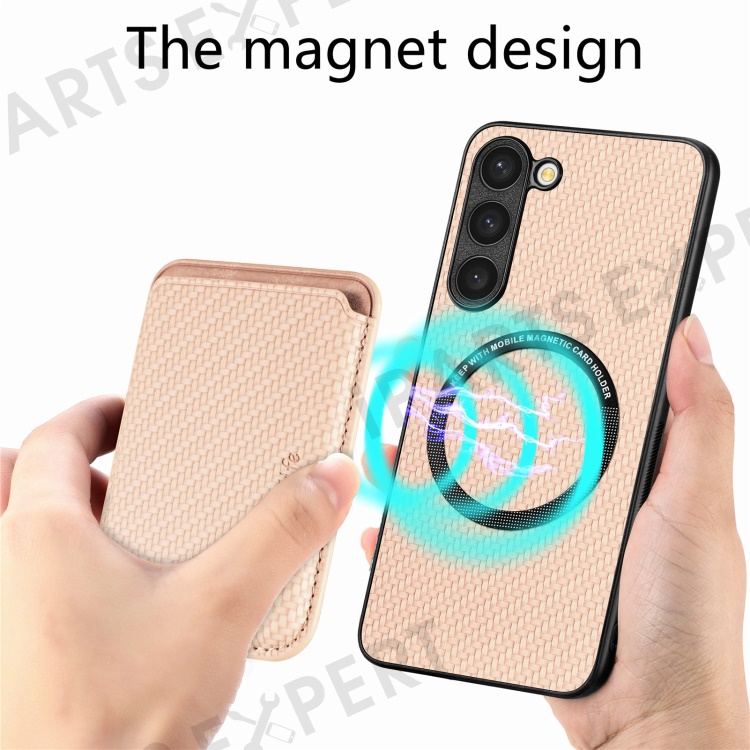 For Samsung Galaxy S23 Carbon Fiber Texture PU Leather + TPU + PVC Phone Case with Magnetic Detachable Card Holder - Khaki