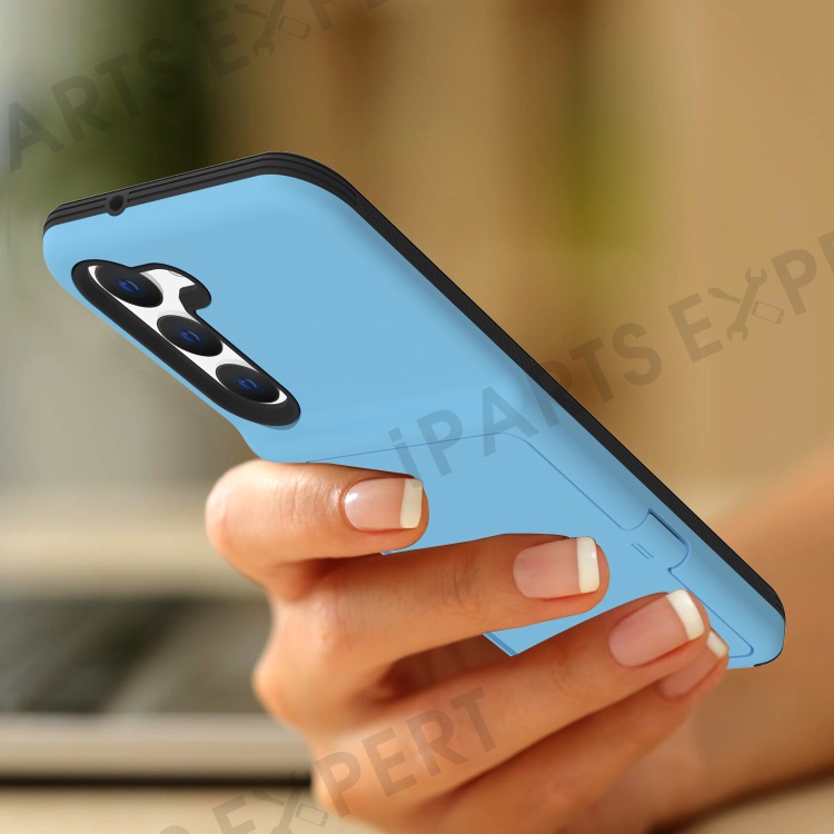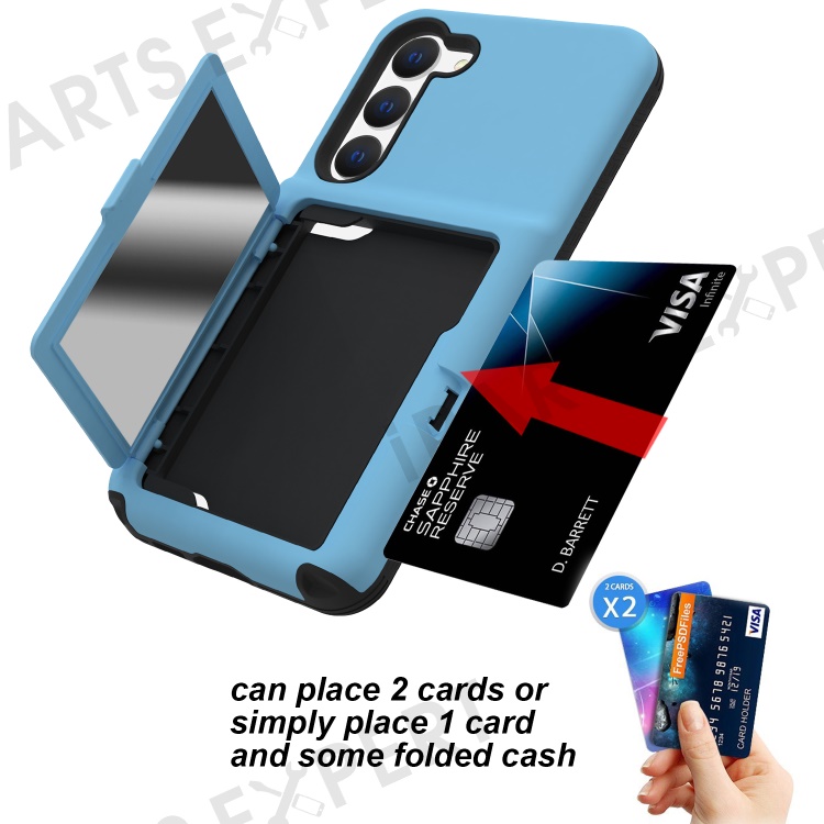 For Samsung Galaxy S23+ Cardcase Series Mirror Function Phone Case Kickstand Card Holder Thickened Phone Cover - Sky Blue
