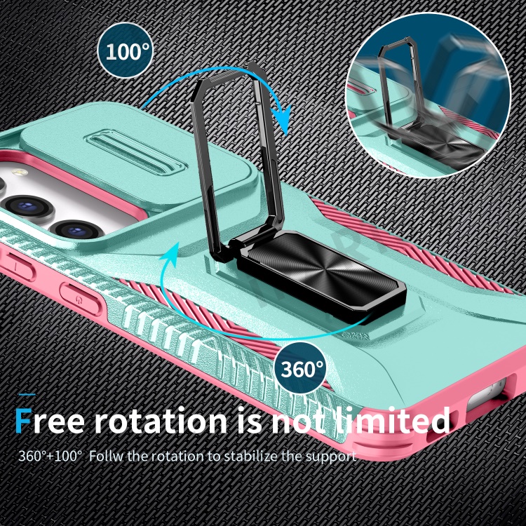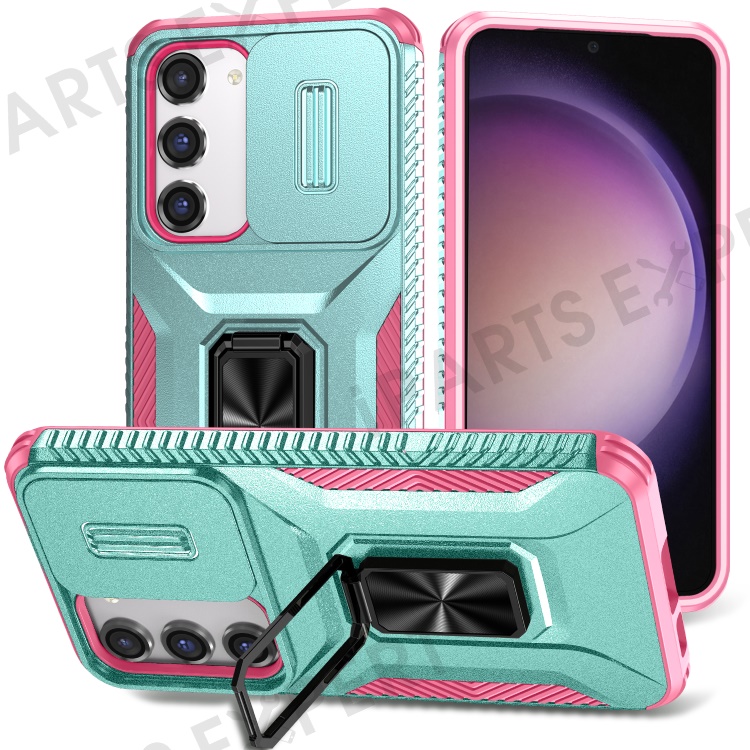 For Samsung Galaxy S23 Case Camshield Kickstand TPU+PC Anti-Slip Phone Cover - Grey Green+Pink