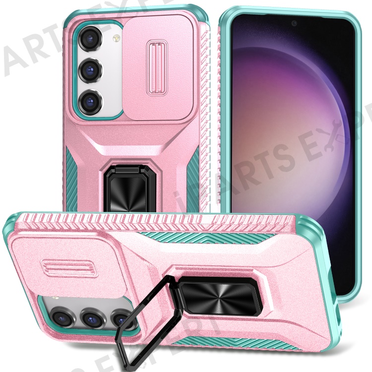 For Samsung Galaxy S23 Case Camshield Kickstand TPU+PC Anti-Slip Phone Cover - Pink+Grey Green