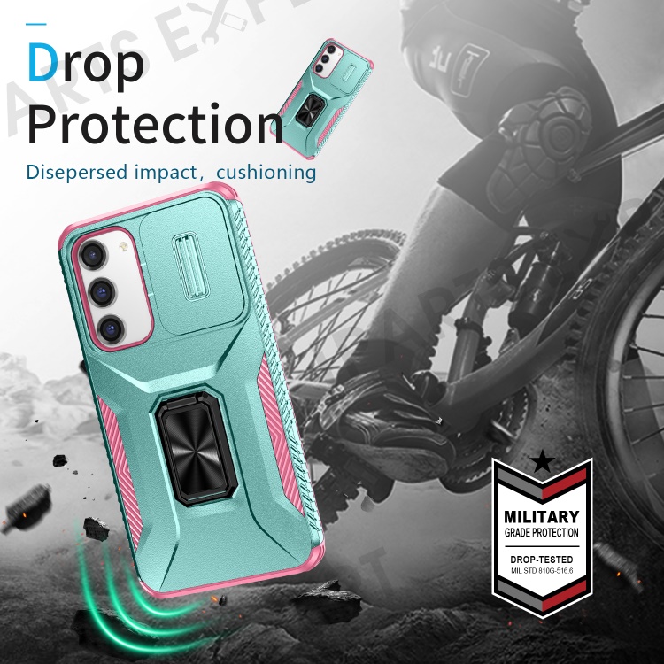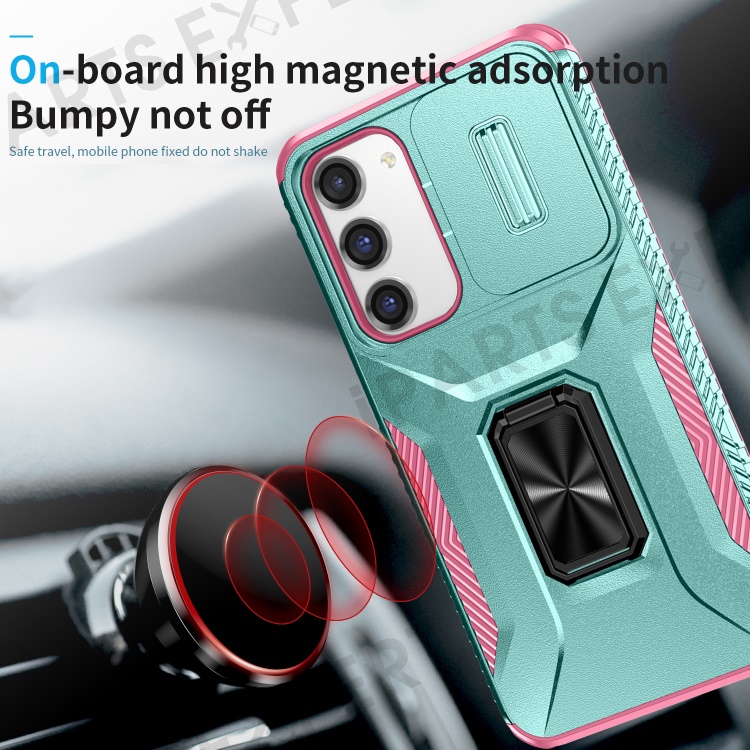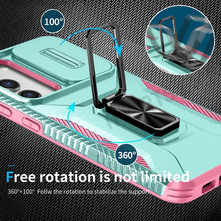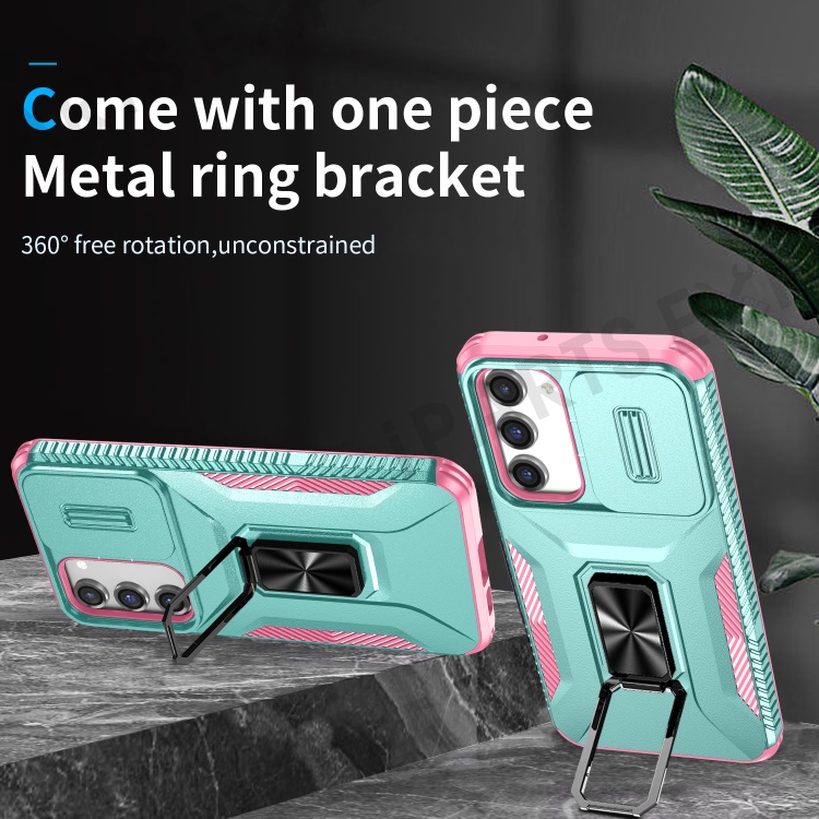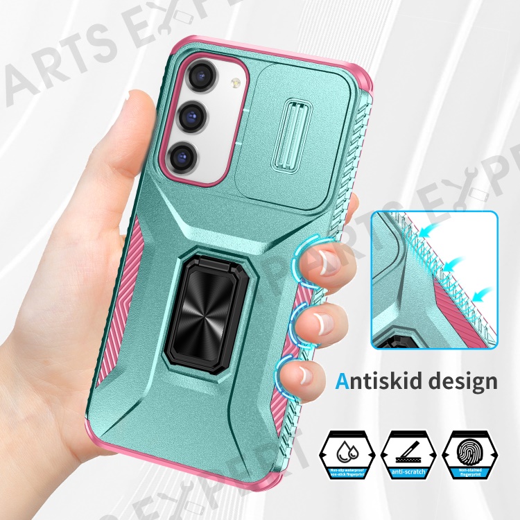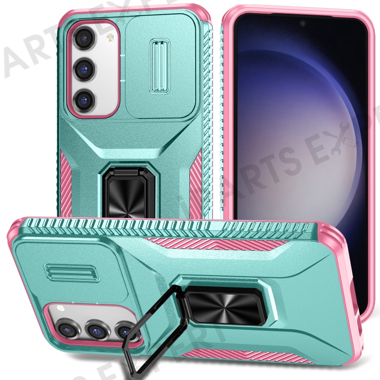 For Samsung Galaxy S23+ Case Slide Lens Lid Anti-scratch PC+TPU Phone Kickstand Cover - Cyan / Pink