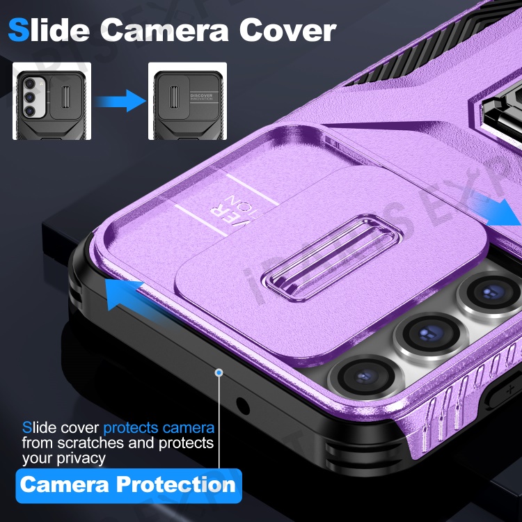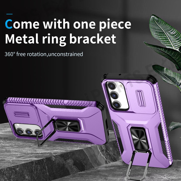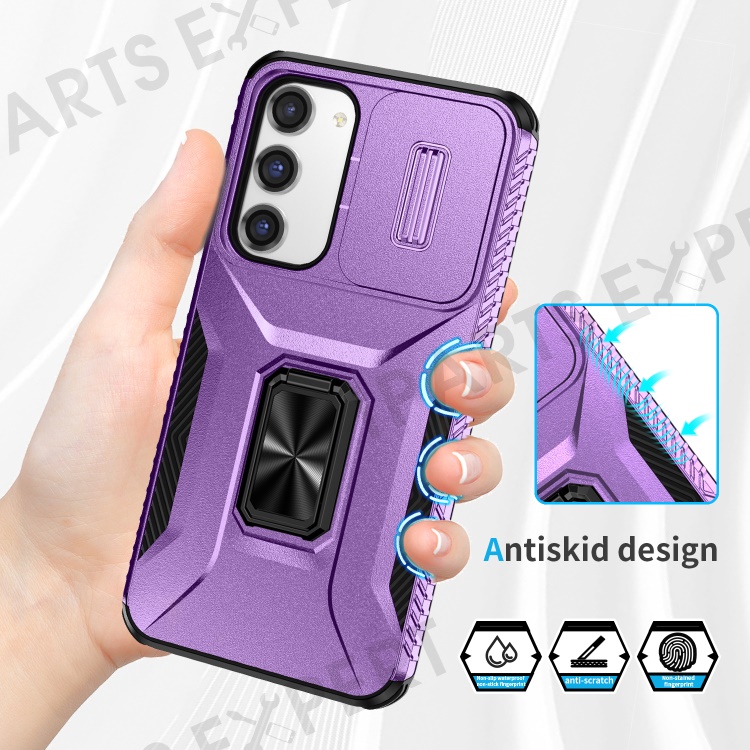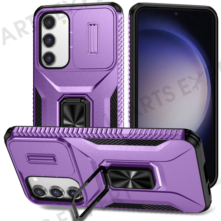 For Samsung Galaxy S23+ Case Slide Lens Lid Anti-scratch PC+TPU Phone Kickstand Cover - Purple