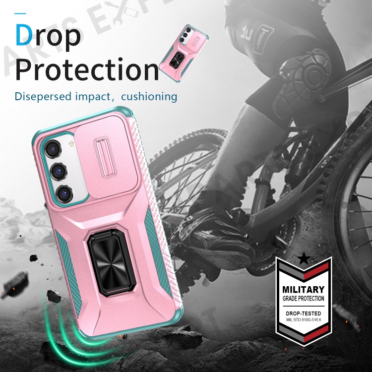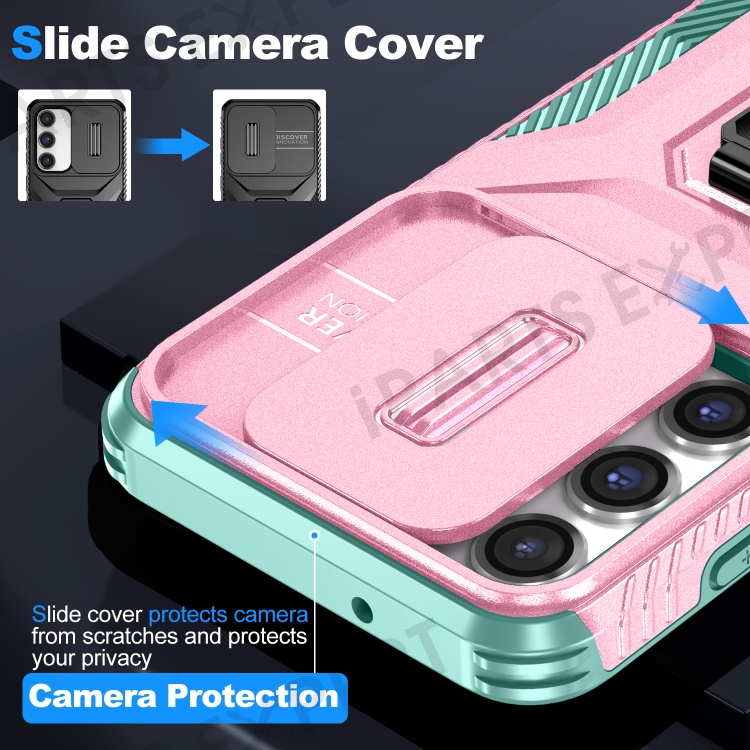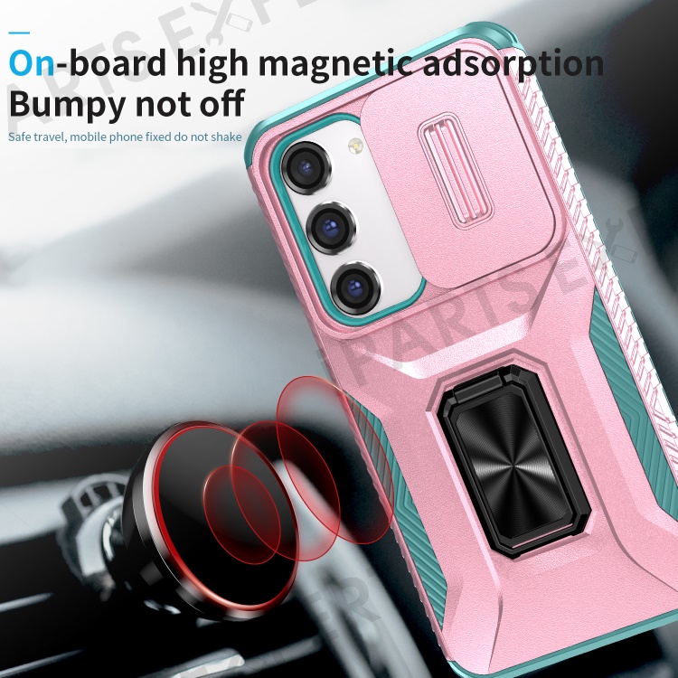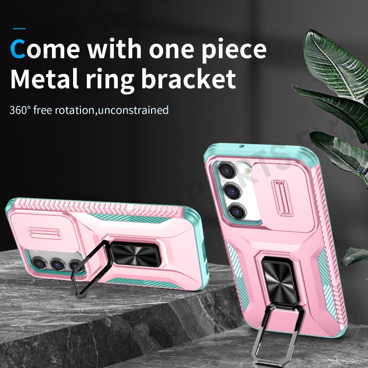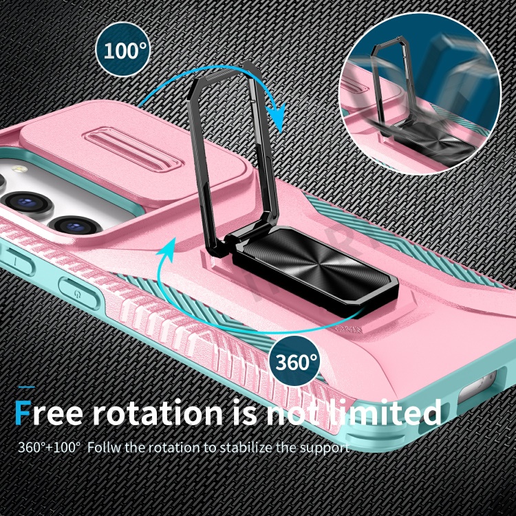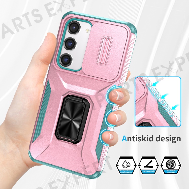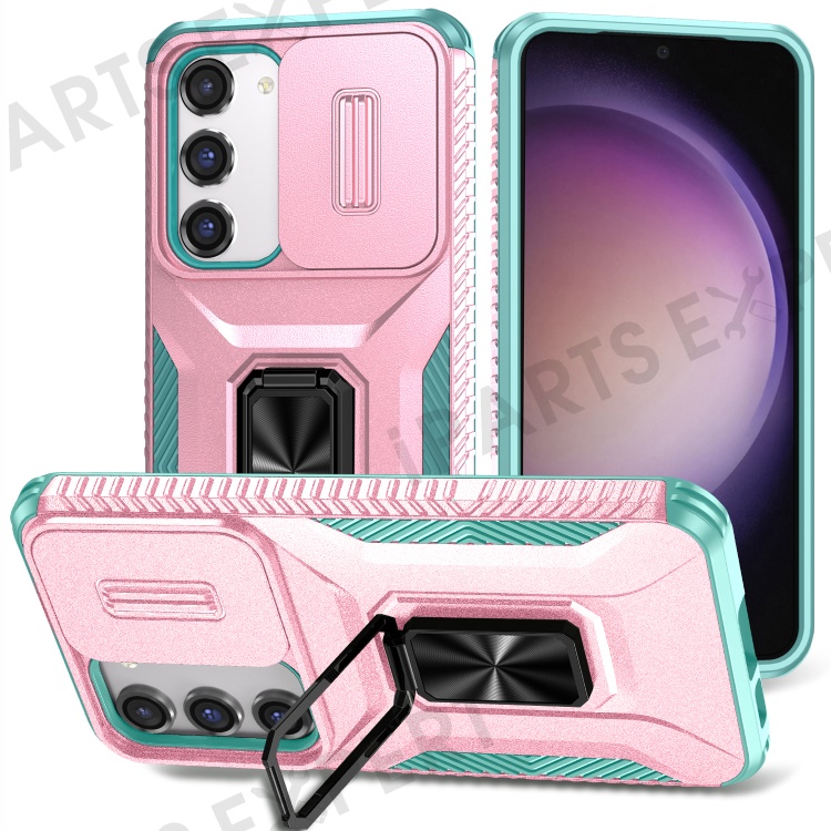 For Samsung Galaxy S23 Case Slide Lens Lid PC+TPU Phone Kickstand Cover - Pink / Cyan