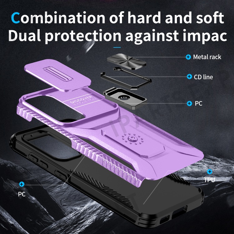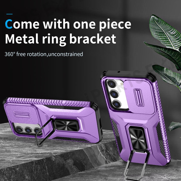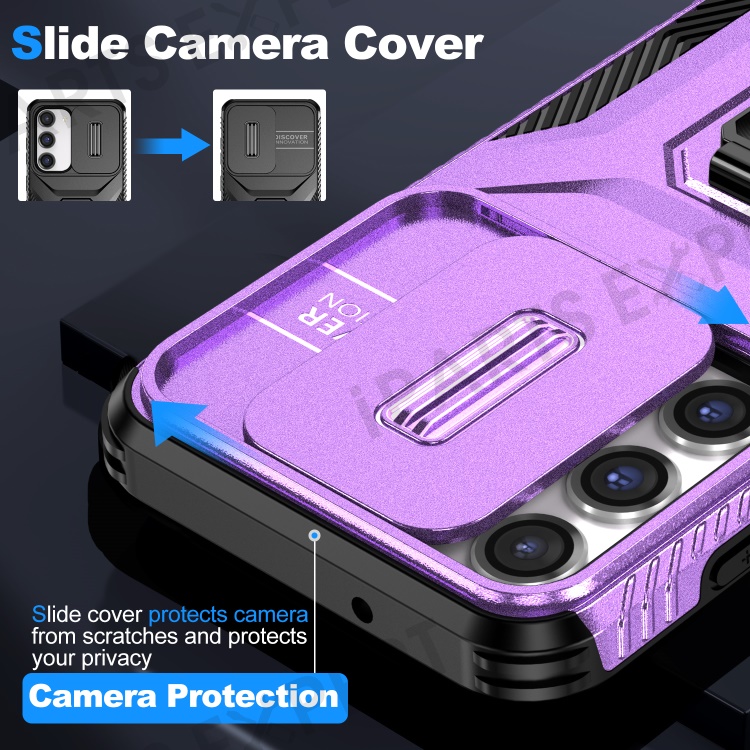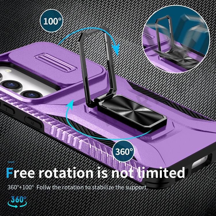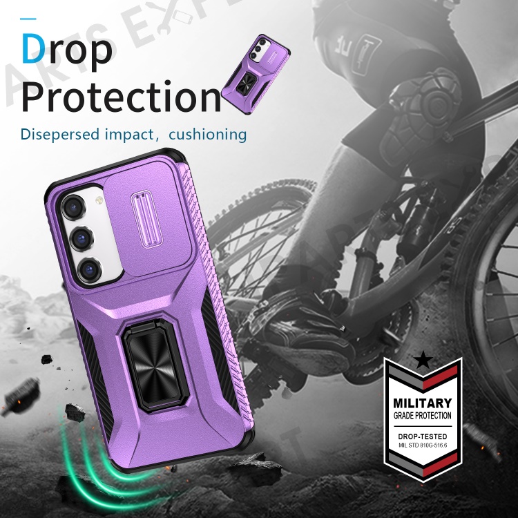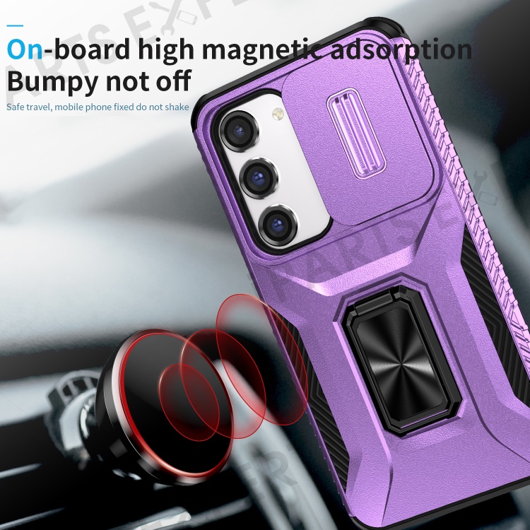For Samsung Galaxy S23 Case Slide Lens Lid PC+TPU Phone Kickstand Cover - Purple