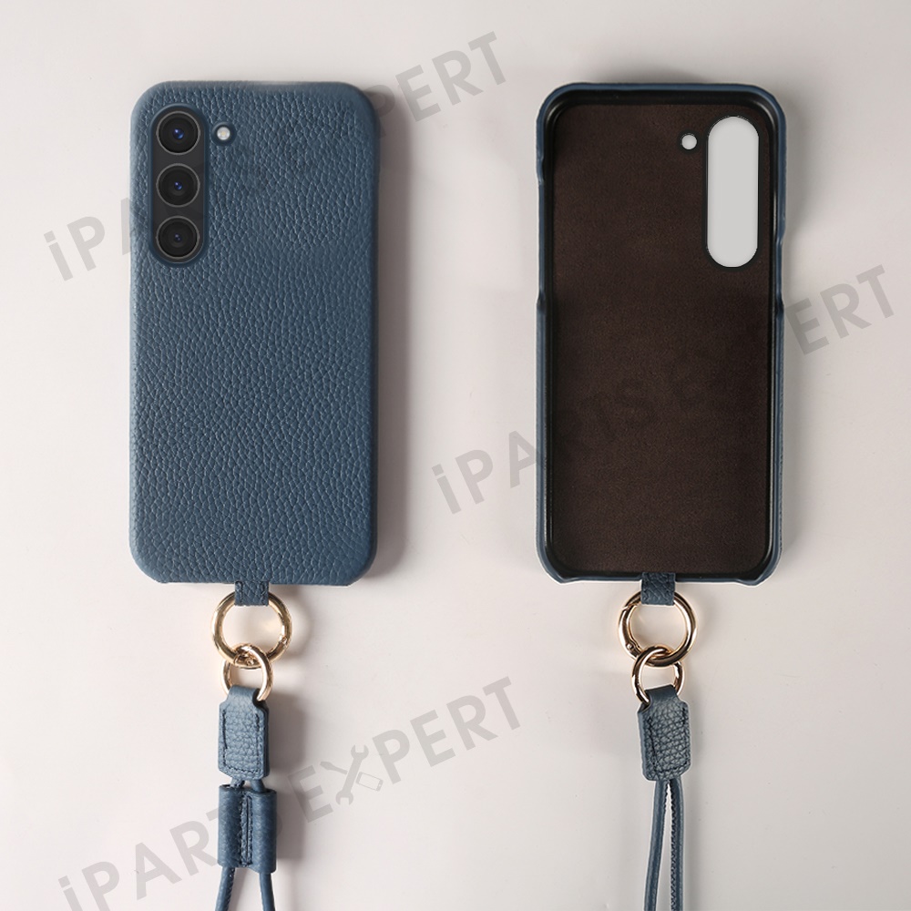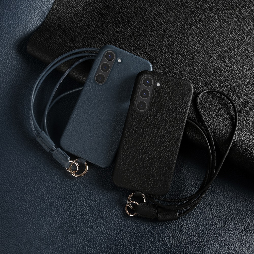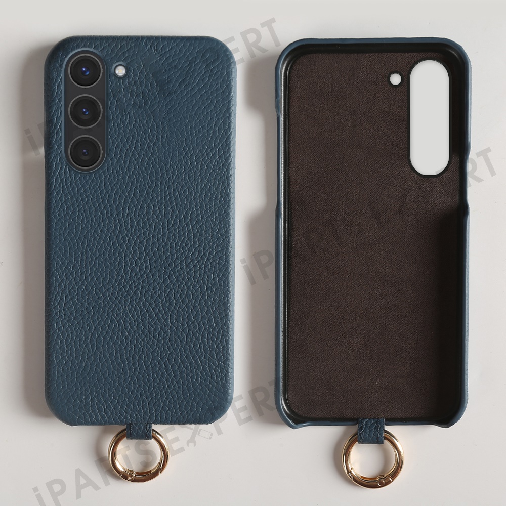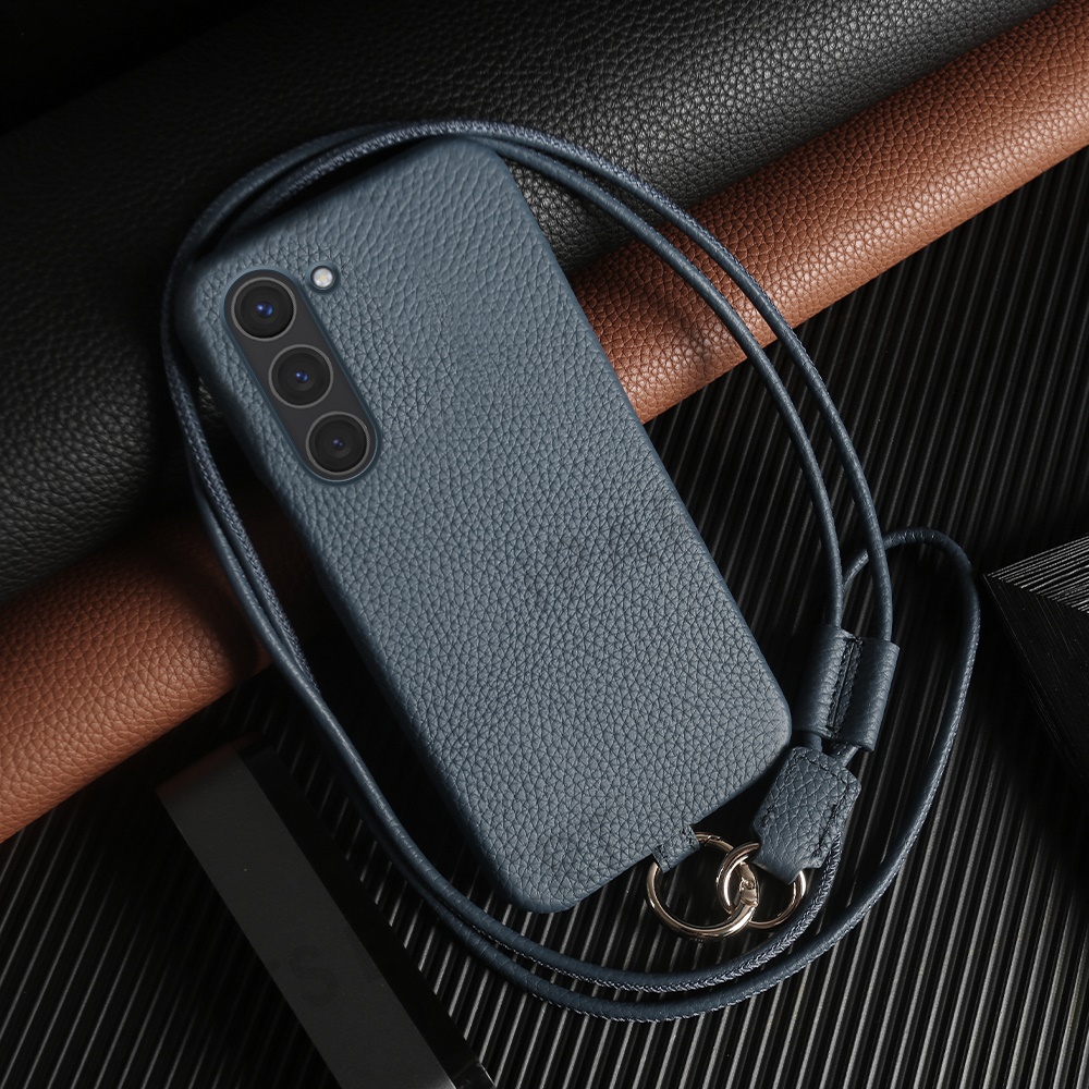 For Samsung Galaxy S23 Case with Lanyard Genuine Cow Leather PC Phone Back Cover - Blue