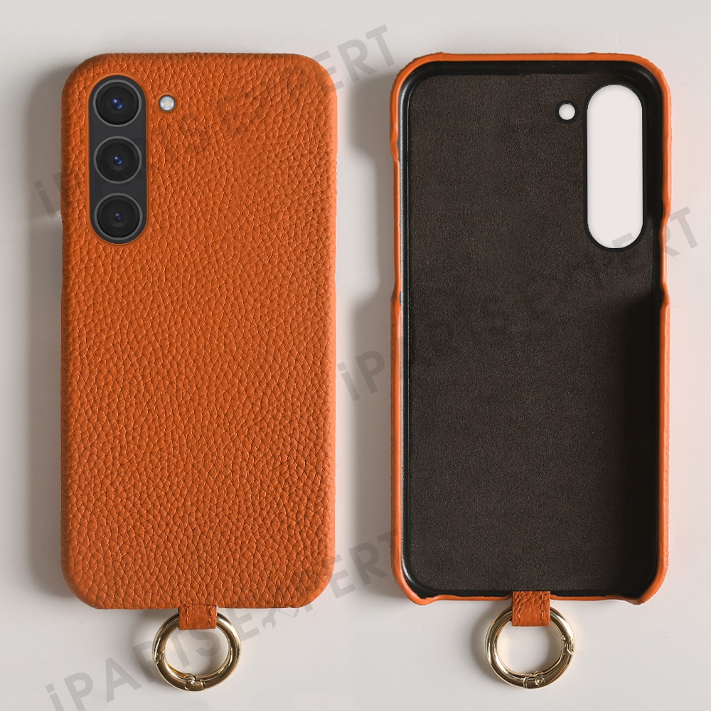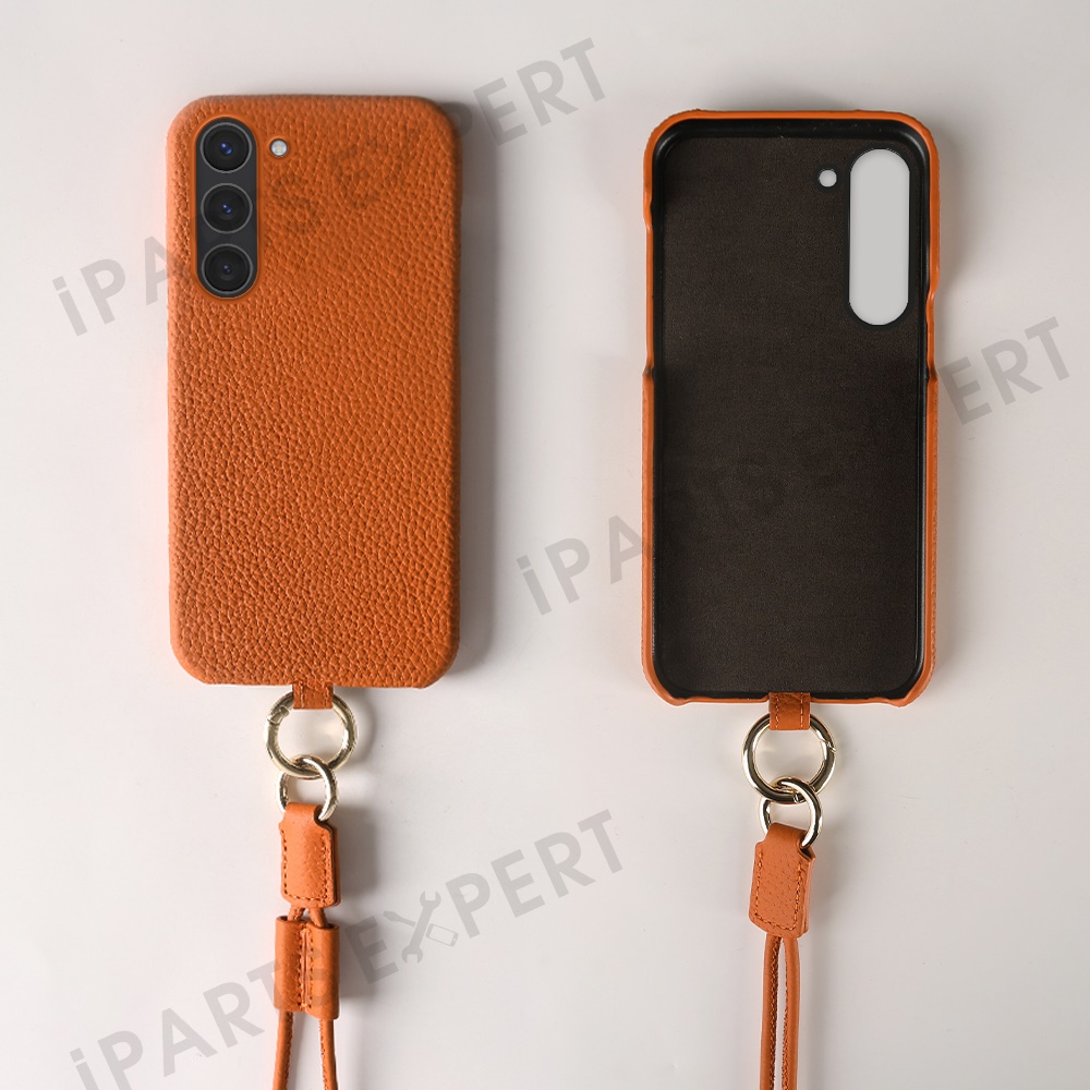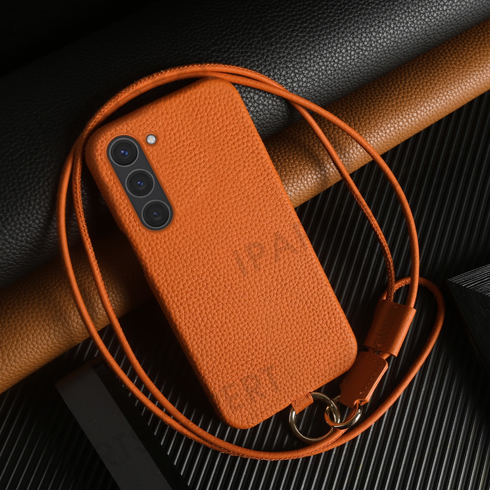 For Samsung Galaxy S23 Case with Lanyard Genuine Cow Leather PC Phone Back Cover - Orange