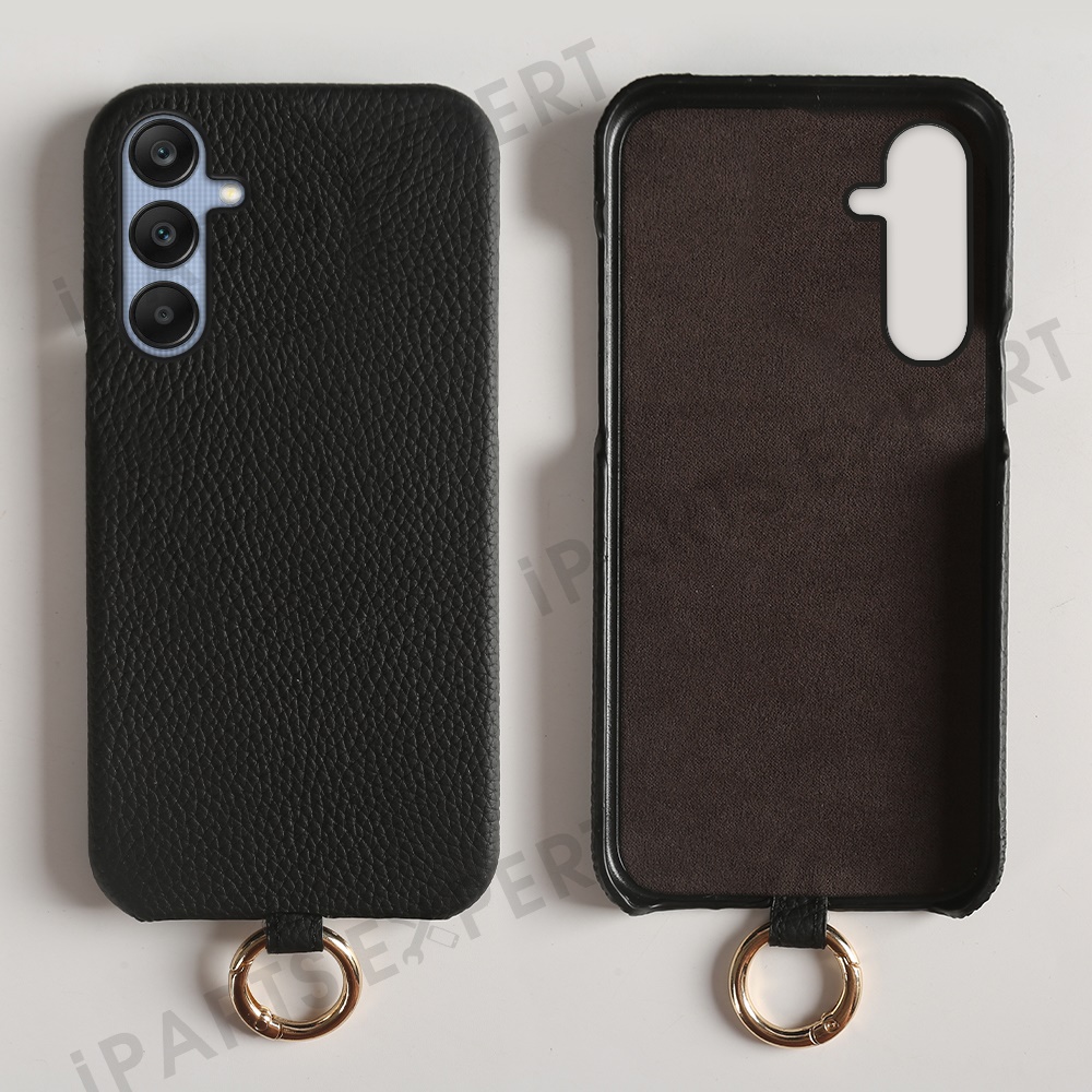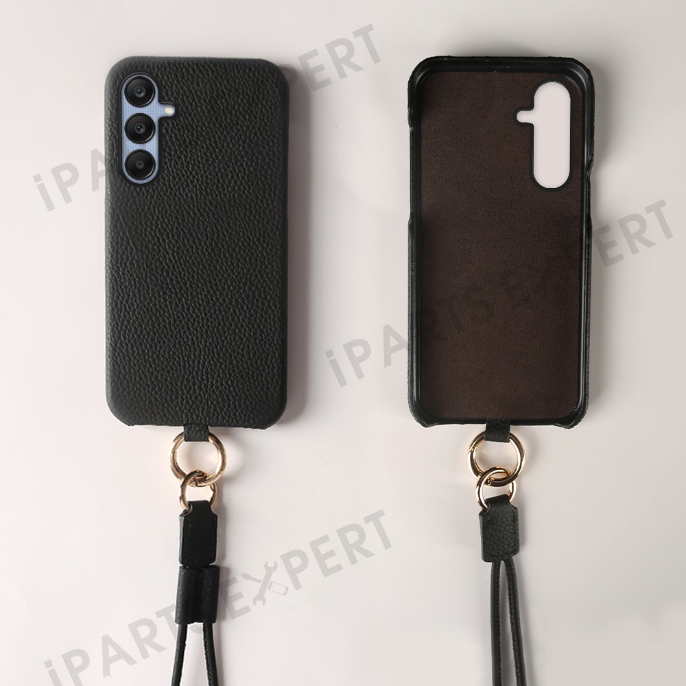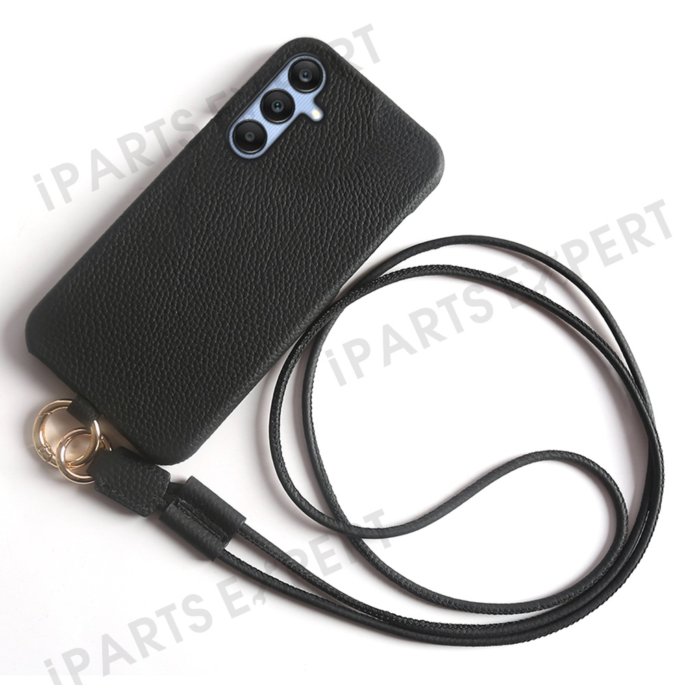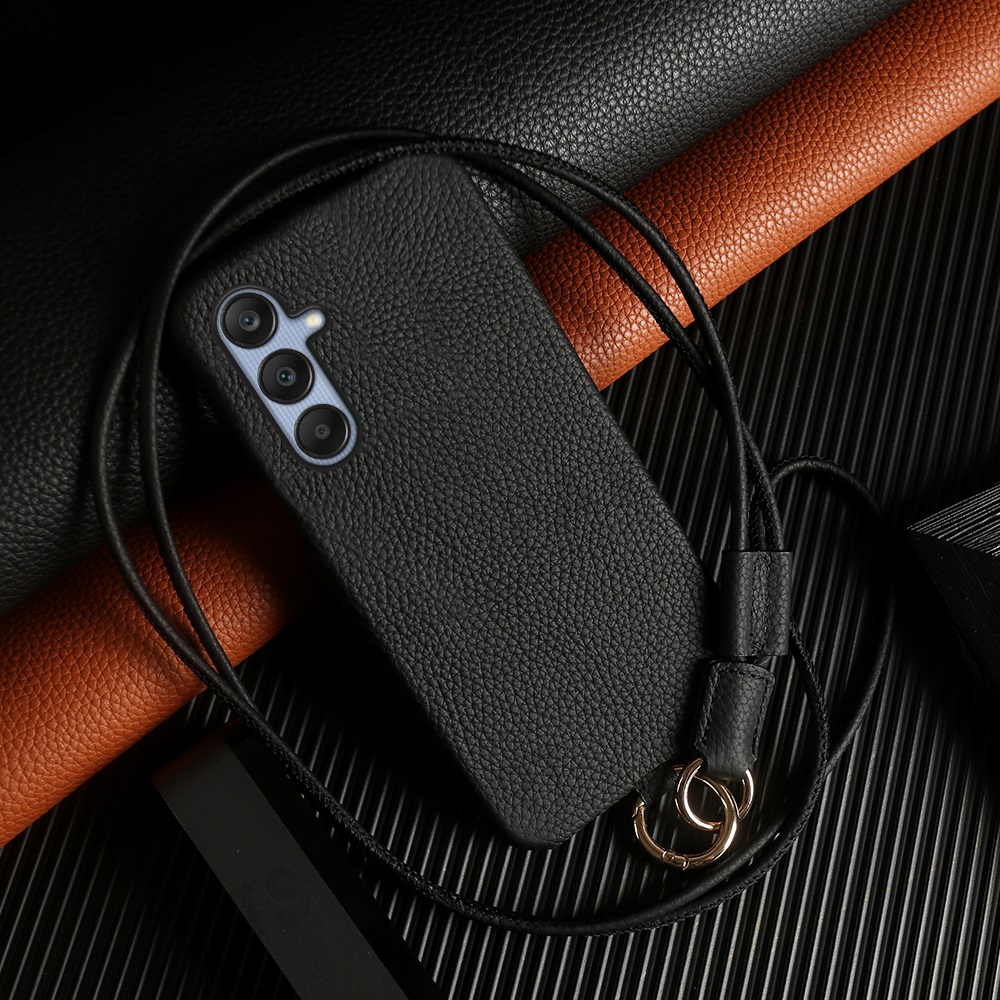 For Samsung Galaxy S23 FE Case with Lanyard Genuine Cow Leather PC Phone Back Cover - Black