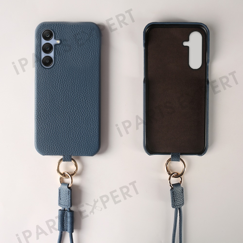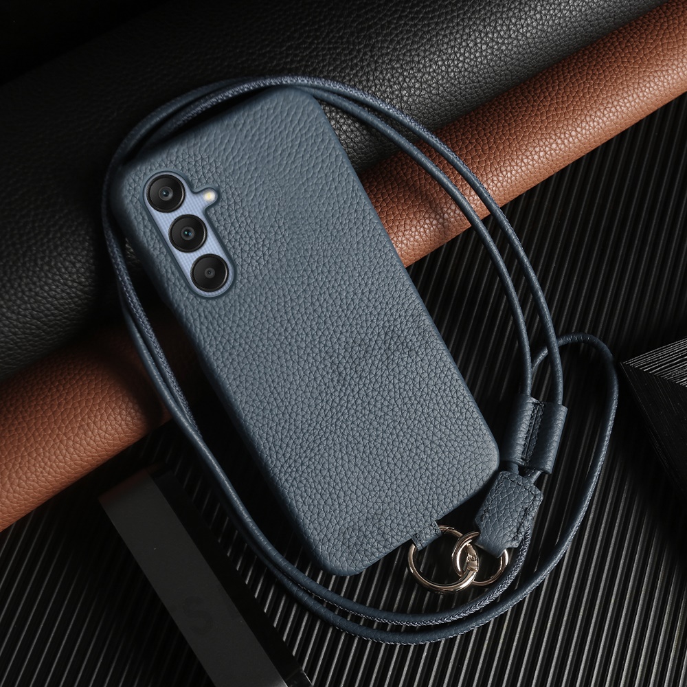For Samsung Galaxy S23 FE Case with Lanyard Genuine Cow Leather PC Phone Back Cover - Blue