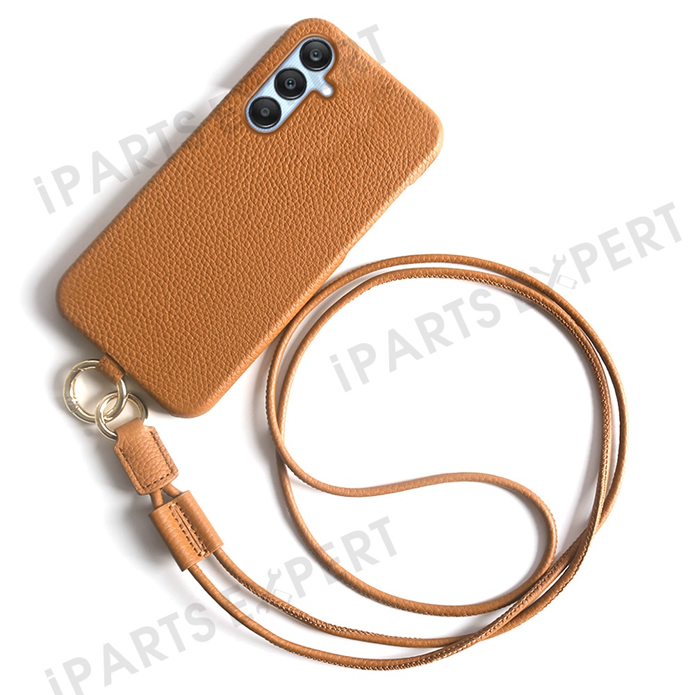 For Samsung Galaxy S23 FE Case with Lanyard Genuine Cow Leather PC Phone Back Cover - Brown