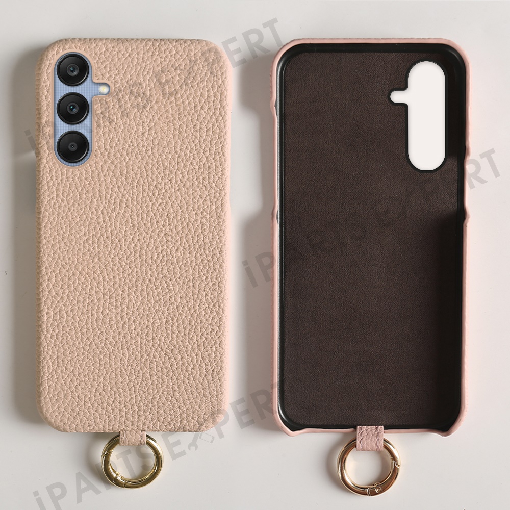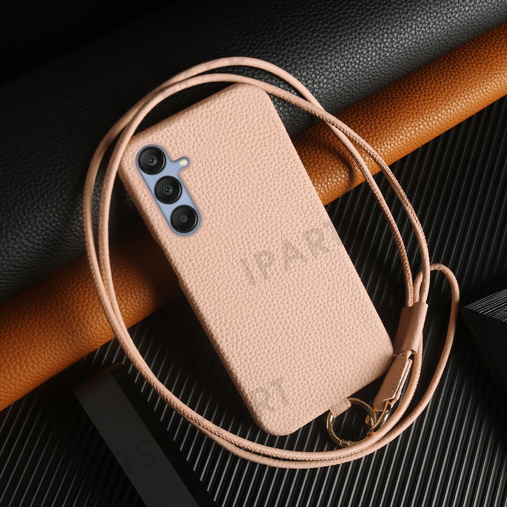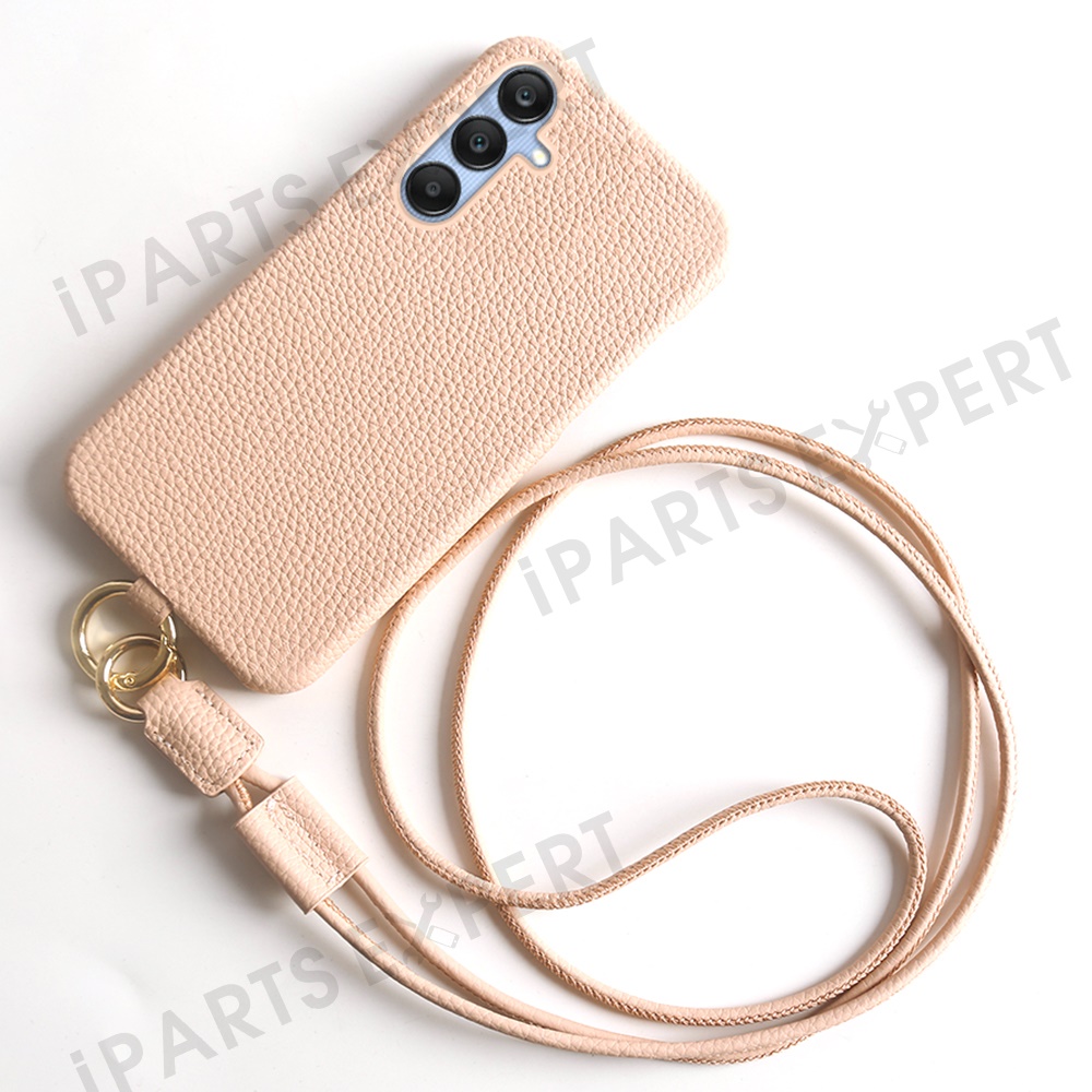 For Samsung Galaxy S23 FE Case with Lanyard Genuine Cow Leather PC Phone Back Cover - Pink