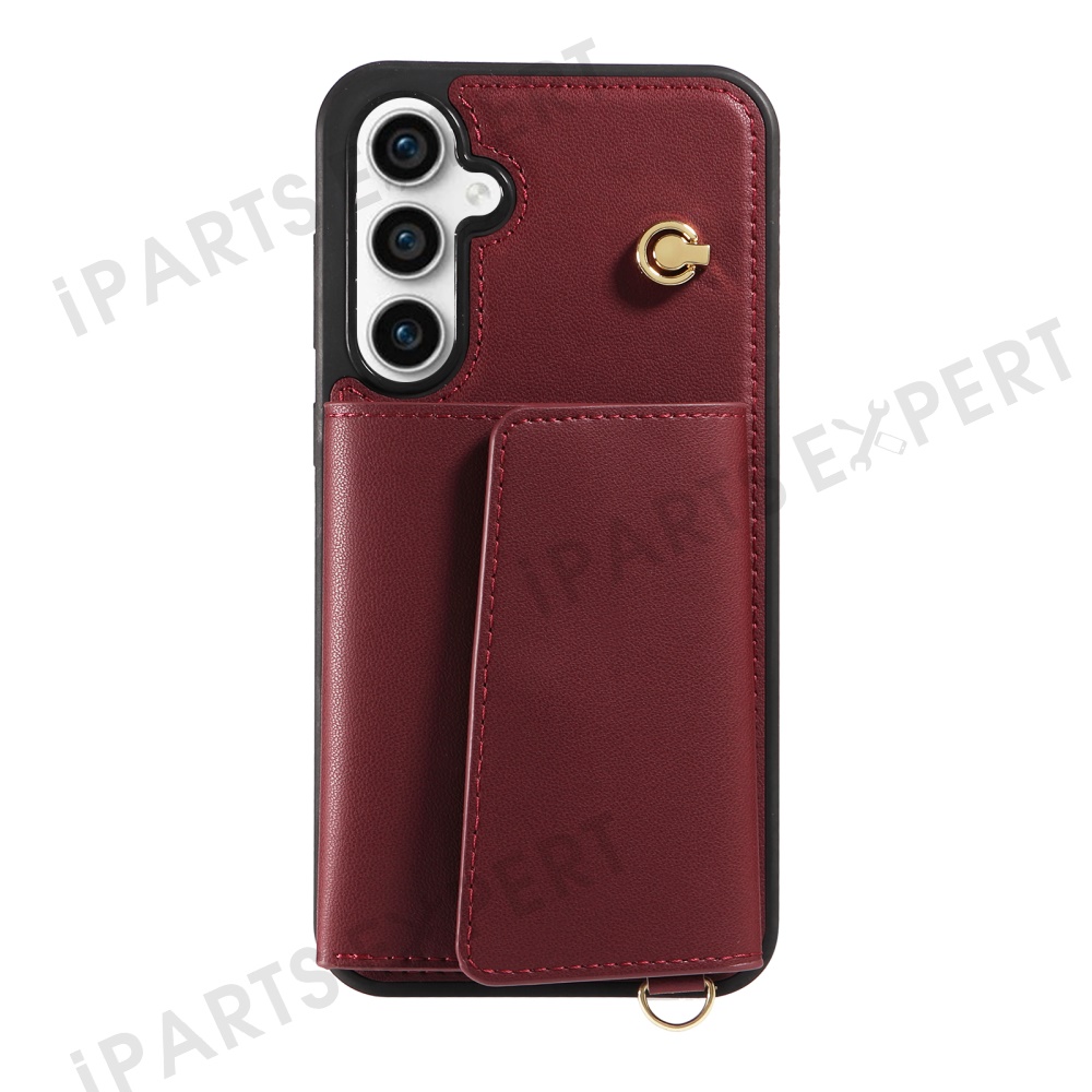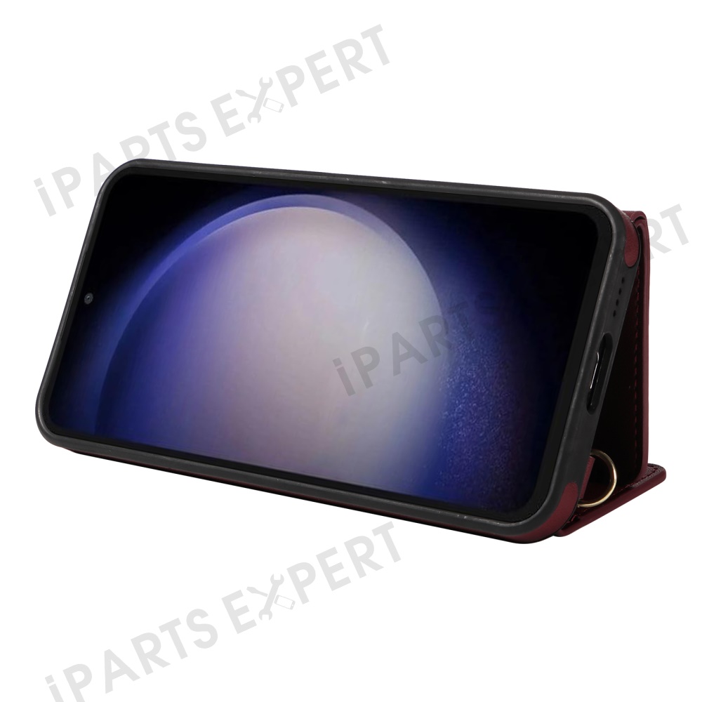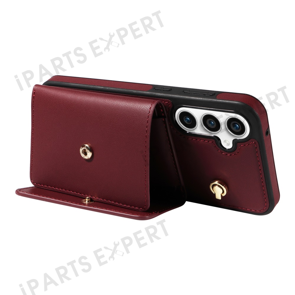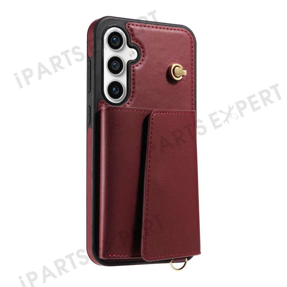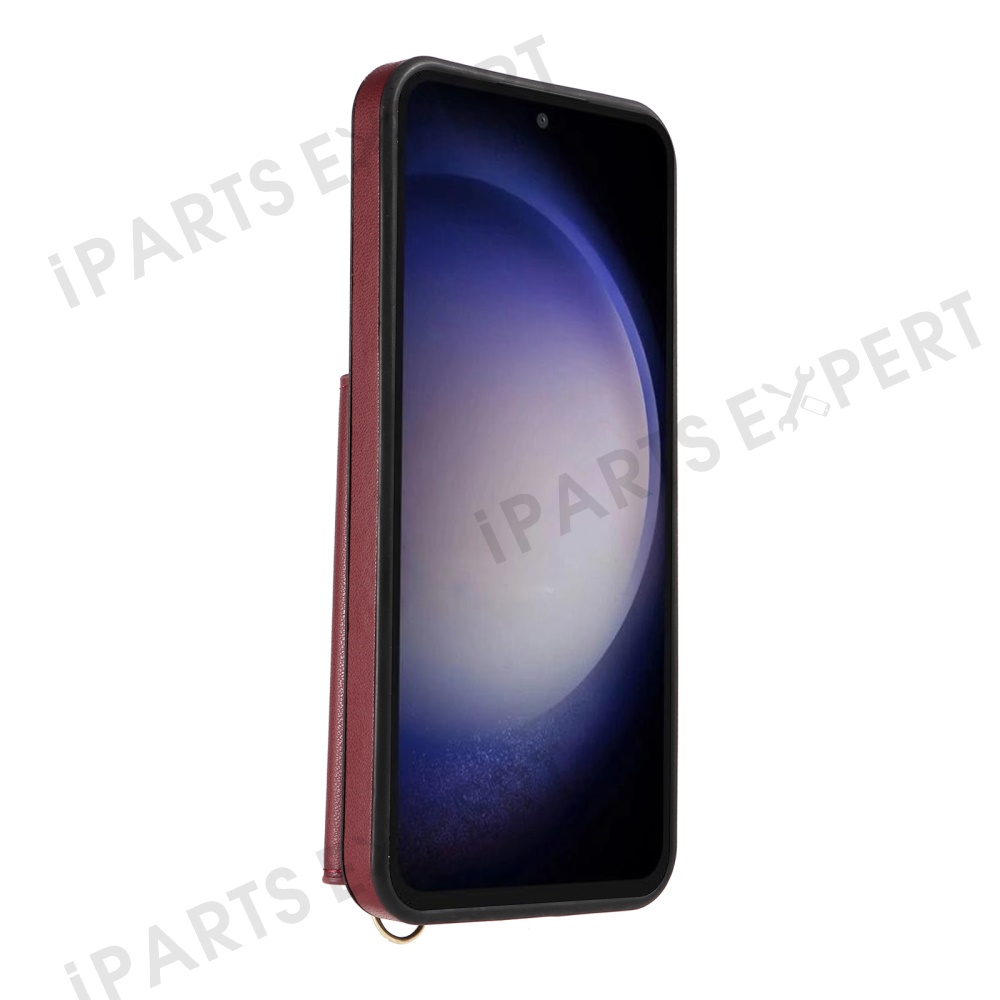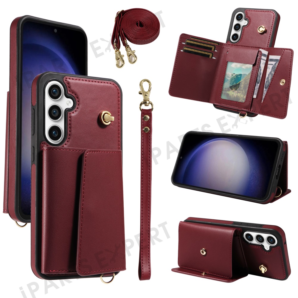 For Samsung Galaxy S23 FE Crossbody Phone Case Card Holder Kickstand Leather Coated TPU Mobile Cover - Wine Red