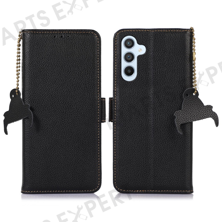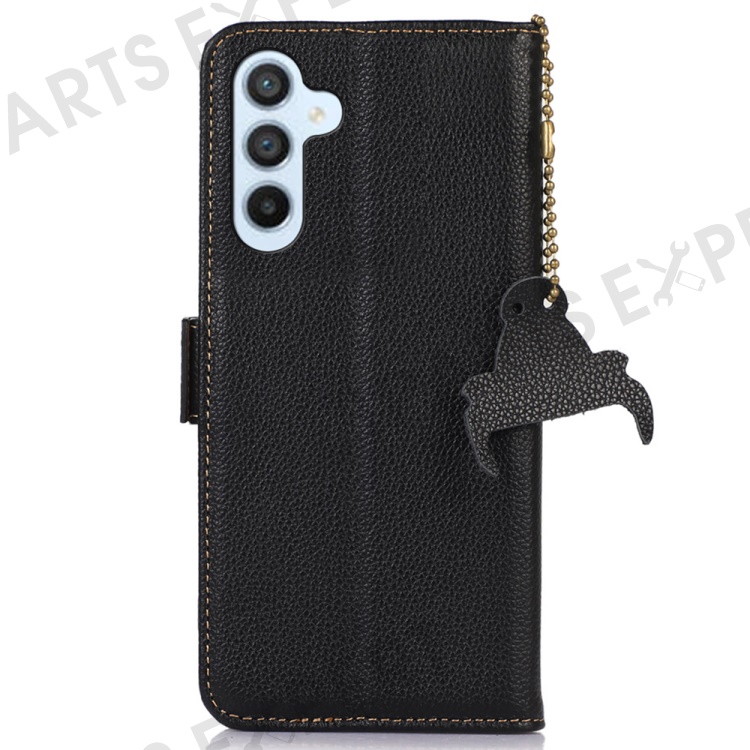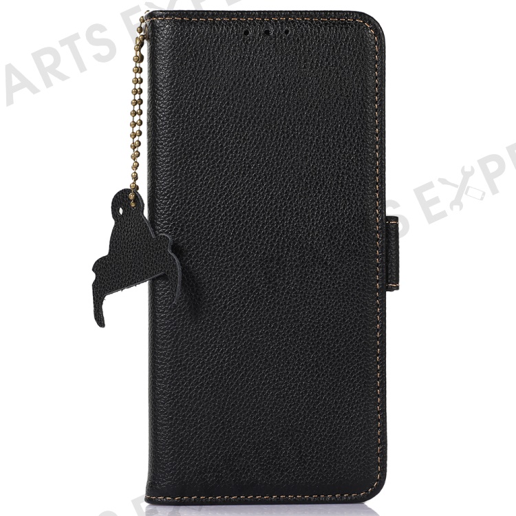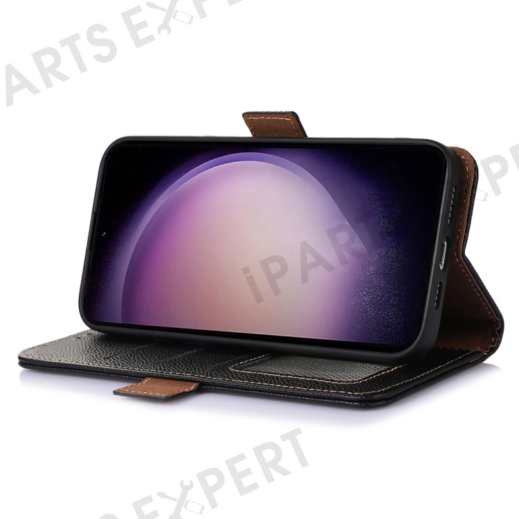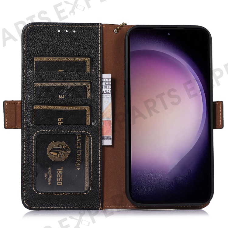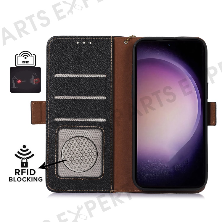For Samsung Galaxy S23 FE RFID Blocking Phone Case Genuine Cow Leather Stand Wallet Litchi Texture Cover - Black