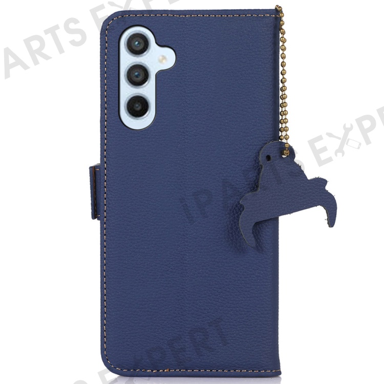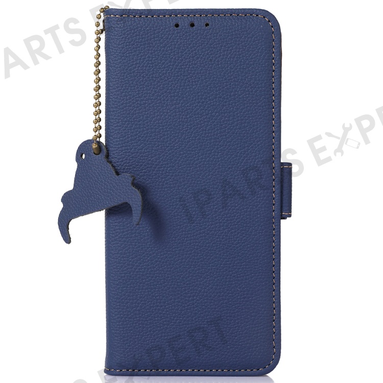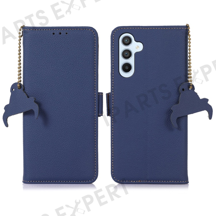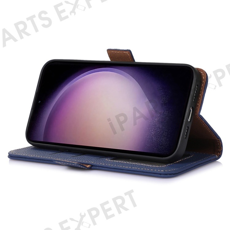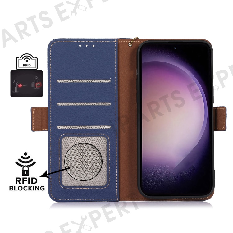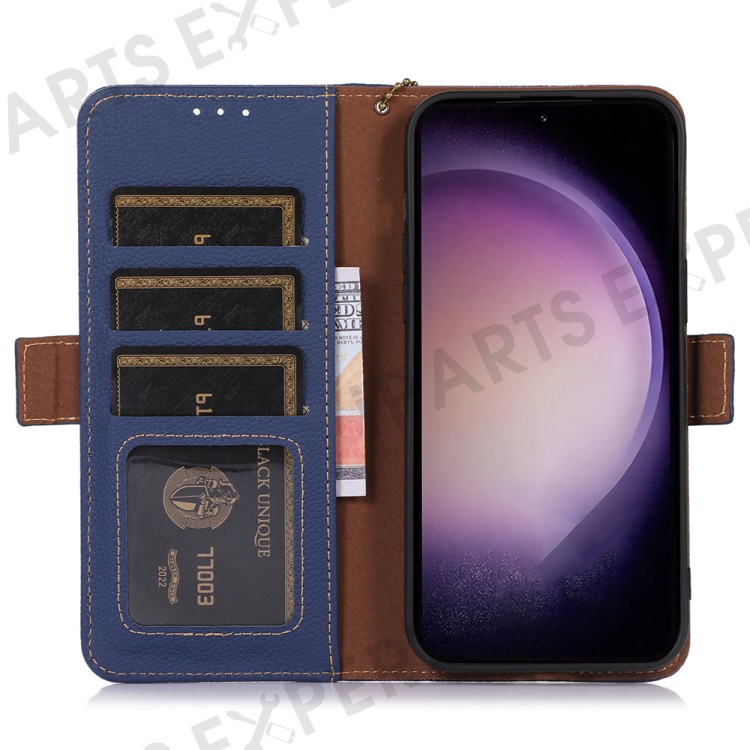 For Samsung Galaxy S23 FE RFID Blocking Phone Case Genuine Cow Leather Stand Wallet Litchi Texture Cover - Sapphire
