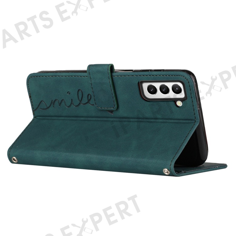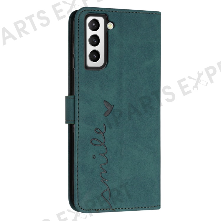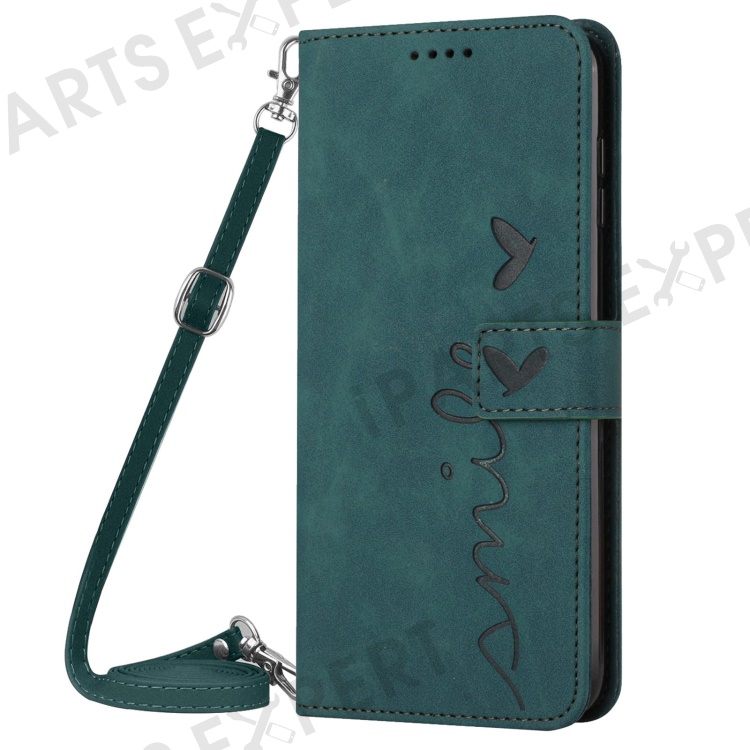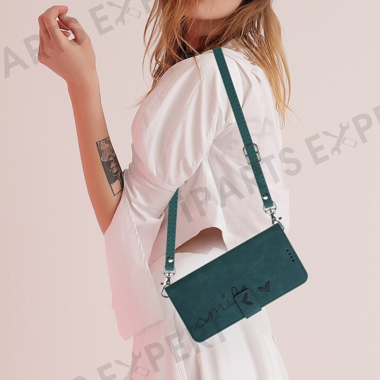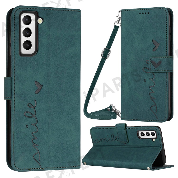 For Samsung Galaxy S23 Heart Shape Imprinted Wallet Horizontal Stand Case Skin-touch Feeling PU Leather Phone Cover with Shoulder Strap - Green
