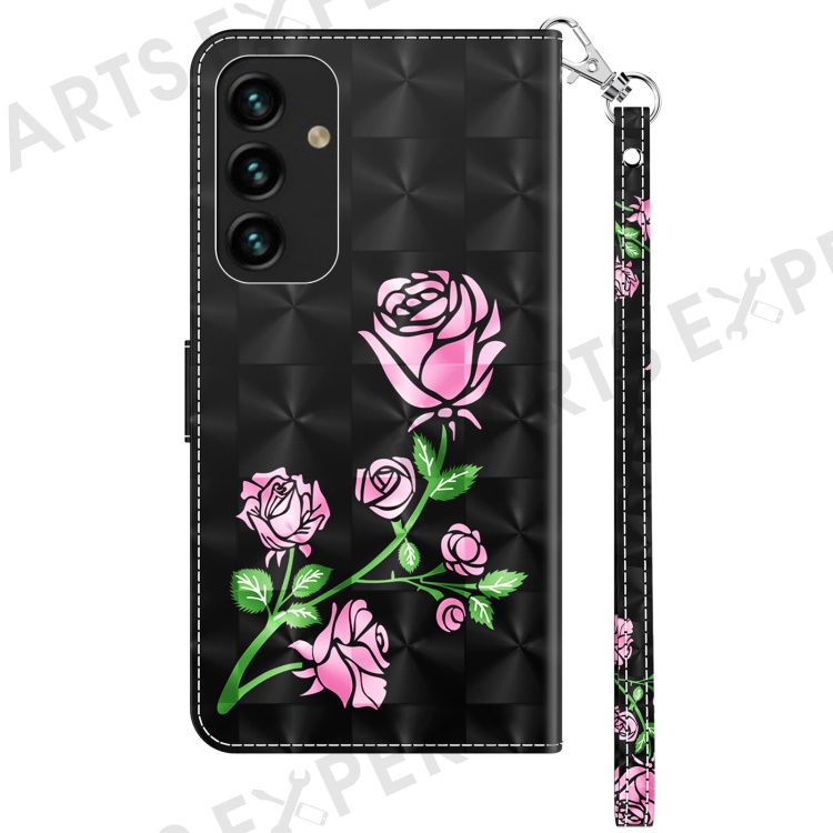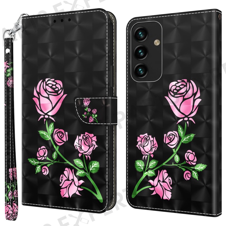 For Samsung Galaxy S23+ PU Leather 3D Pattern Printing Shockproof Case Foldable Stand Phone Wallet Cover with Wrist Strap - Rose Flower
