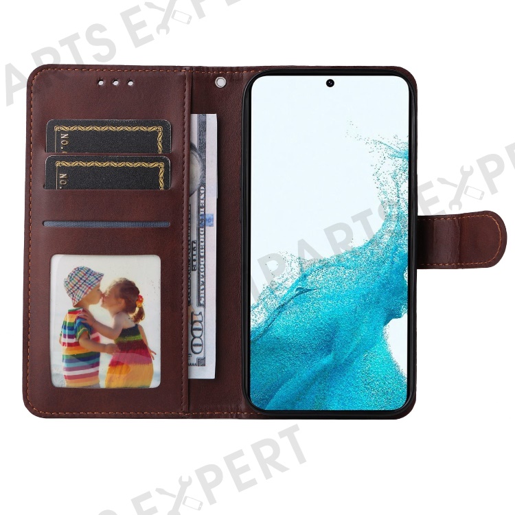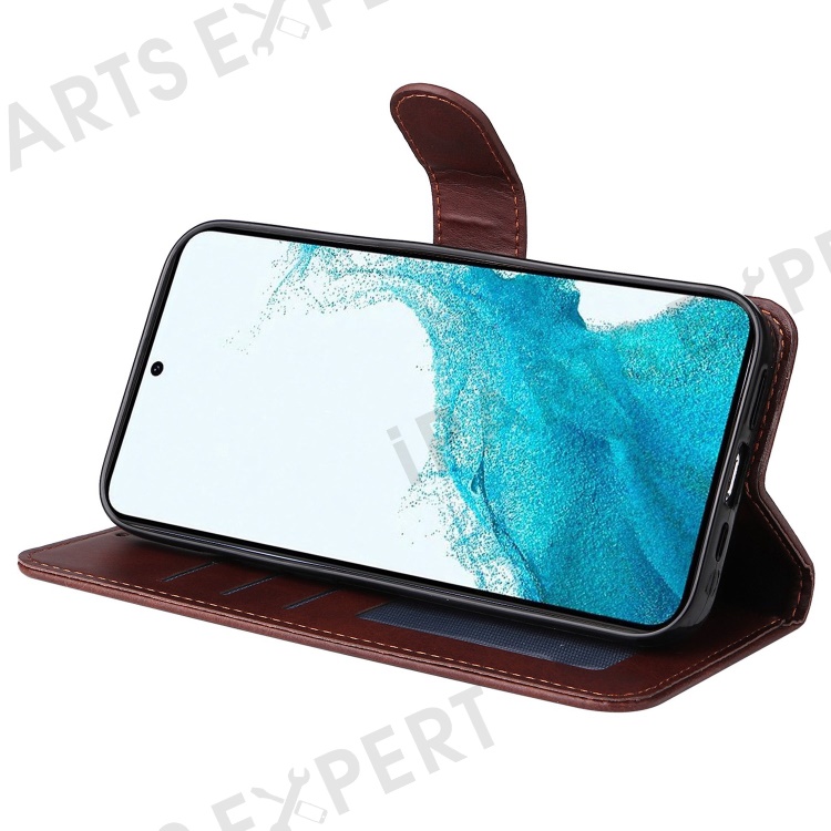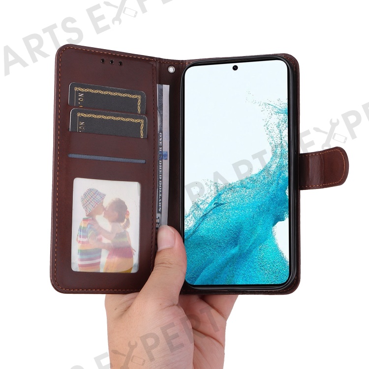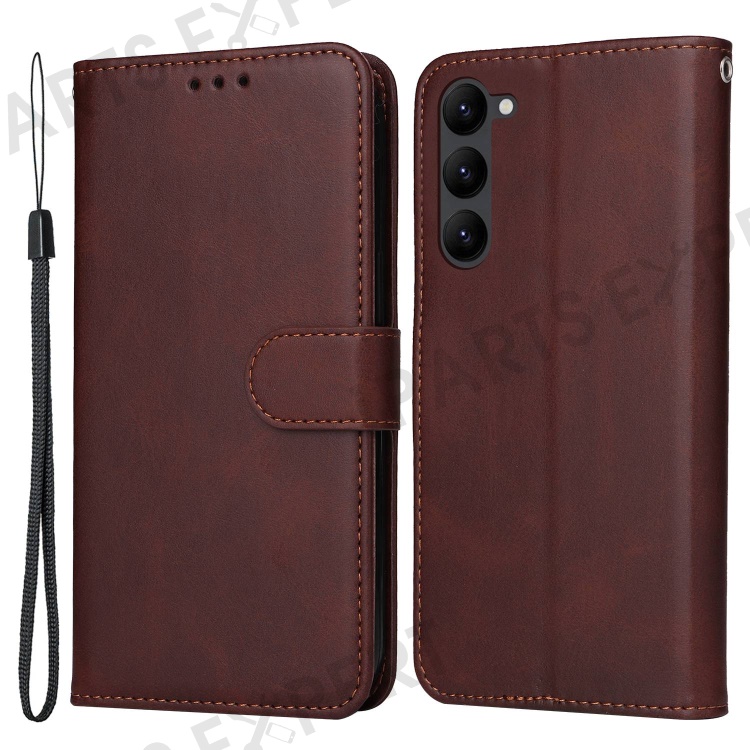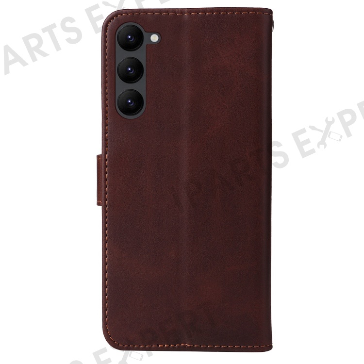 For Samsung Galaxy S23+ Calf Texture Shockproof PU Leather Case Magnetic Clasp Wallet Stand Phone Cover - Brown