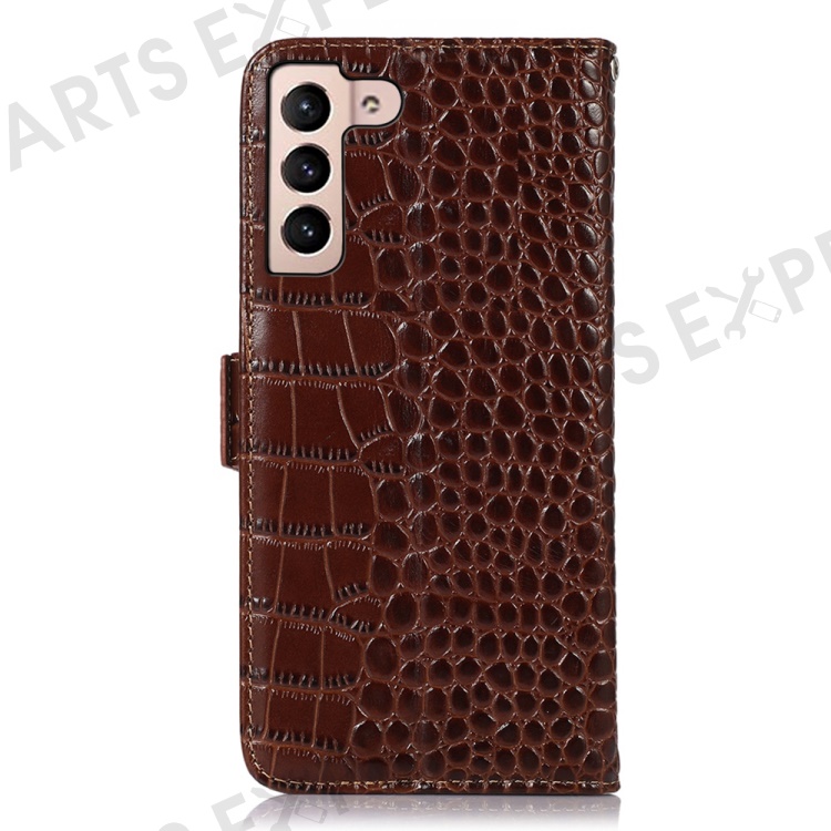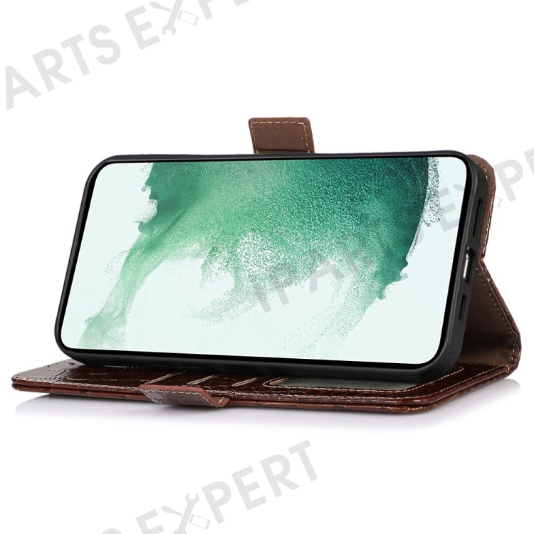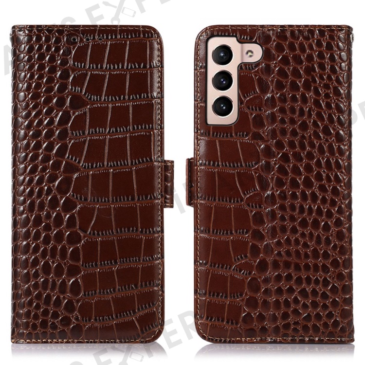 For Samsung Galaxy S23+ Crocodile Texture Wallet Flip Cover Genuine Cowhide Leather Stand RFID Blocking Magnetic Phone Case - Brown