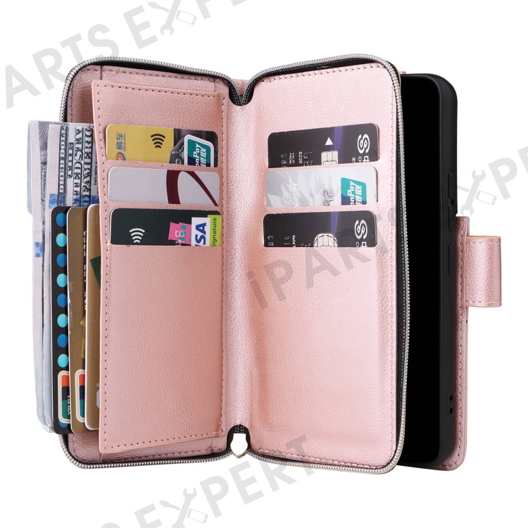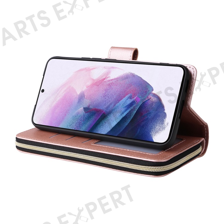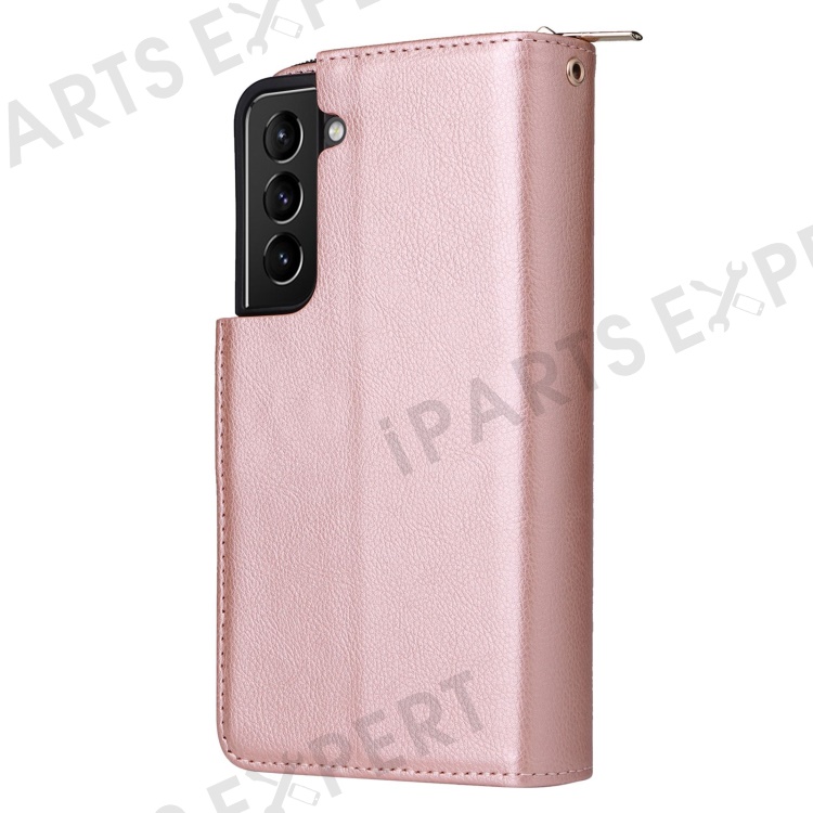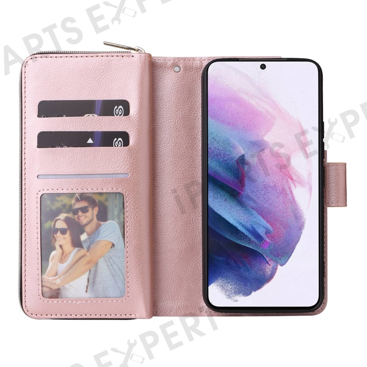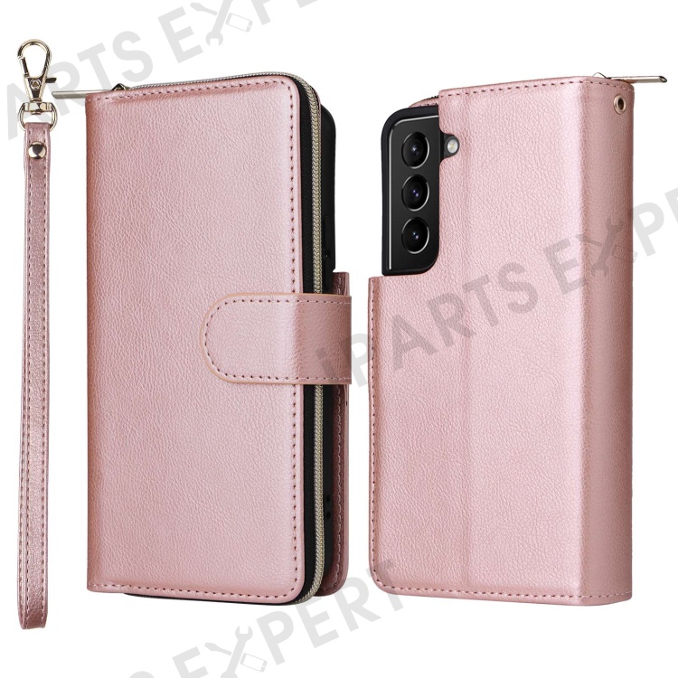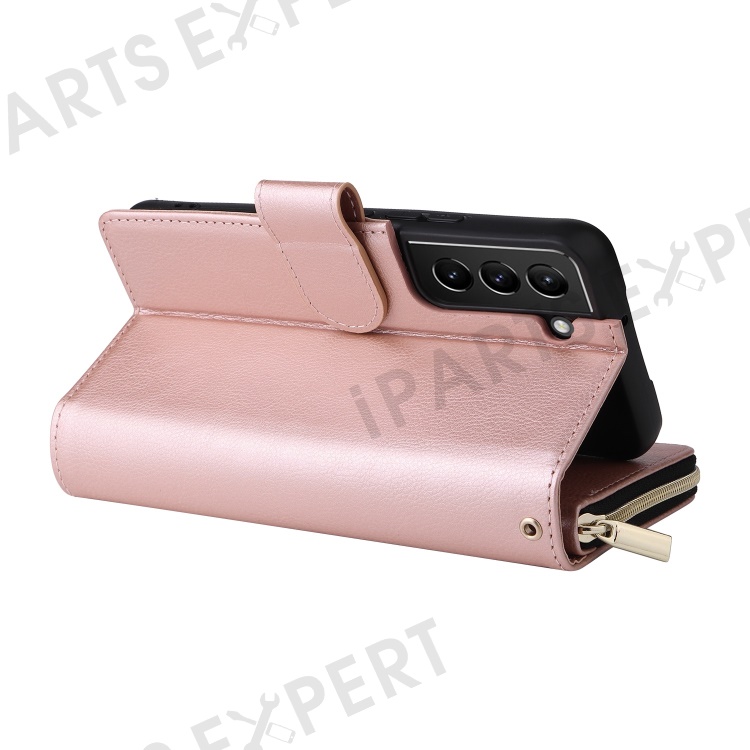 For Samsung Galaxy S23+ Full Protection Stand Wallet Phone Flip Case PU Leather Magnetic 9 Card Holder Slots Zipper Pocket Cover with Strap - Rose Gold