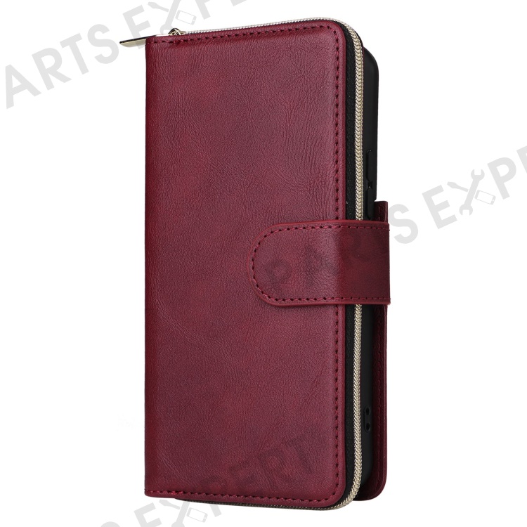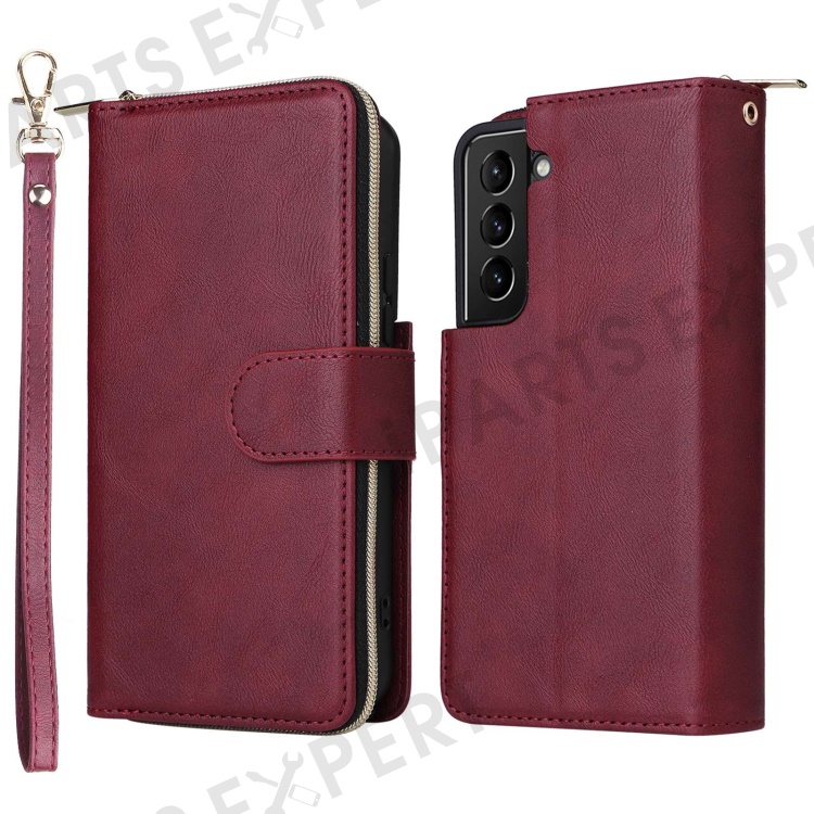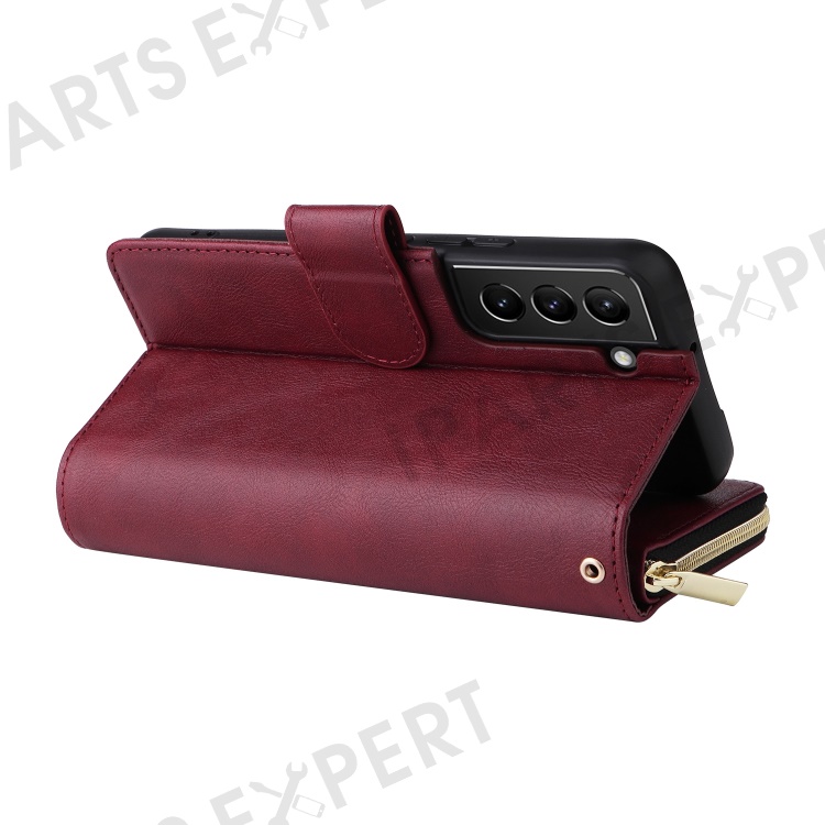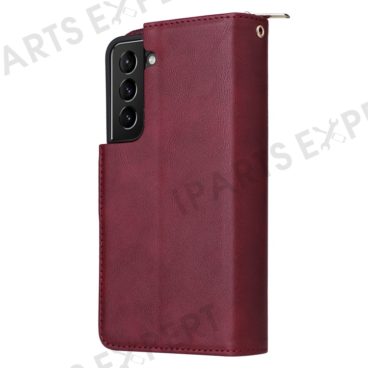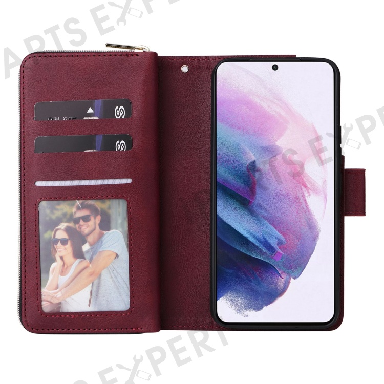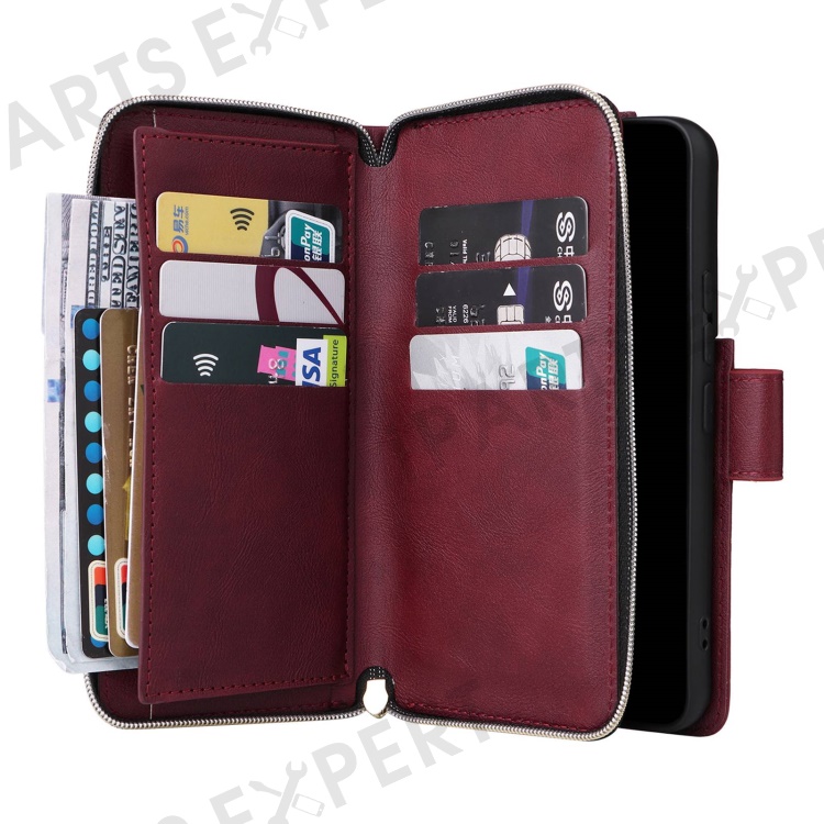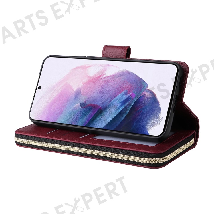 For Samsung Galaxy S23+ Full Protection Stand Wallet Phone Flip Case PU Leather Magnetic 9 Card Holder Slots Zipper Pocket Cover with Strap - Wine Red