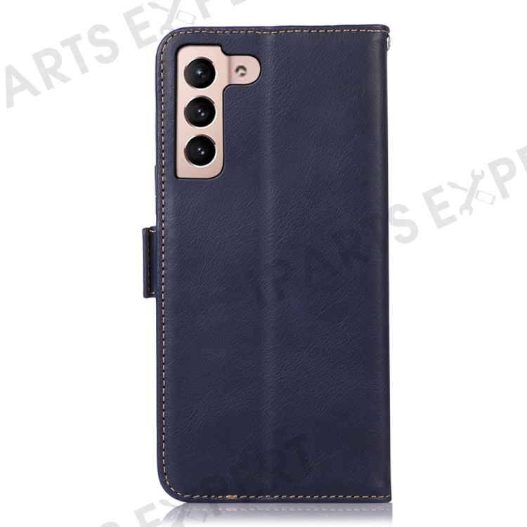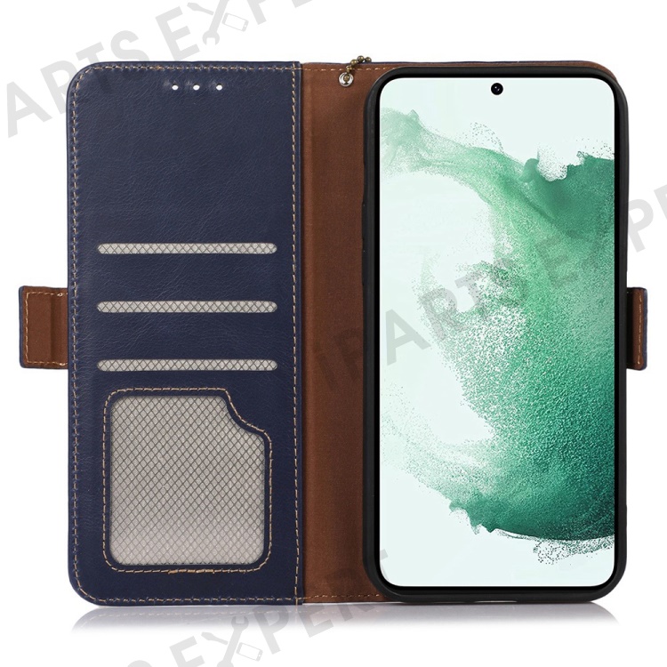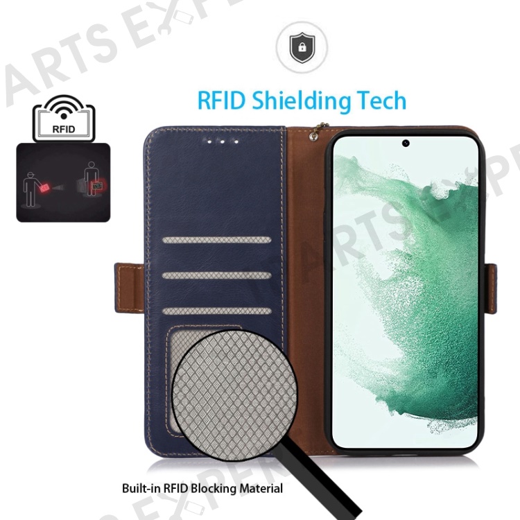 For Samsung Galaxy S23 RFID Blocking Genuine Cowhide Leather Wallet Cover Crazy Horse Texture Magnetic Clasp Stand Book Protective Phone Case - Blue