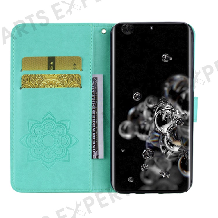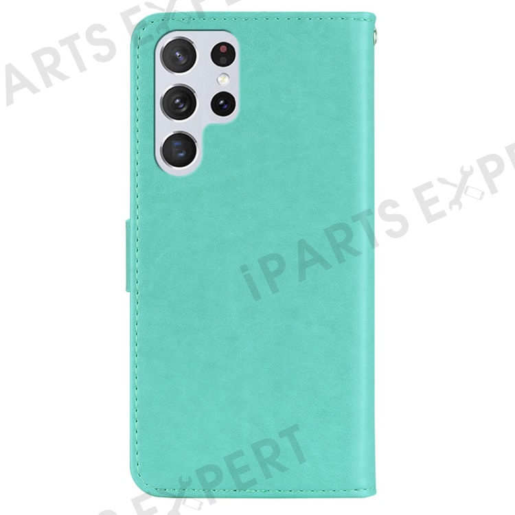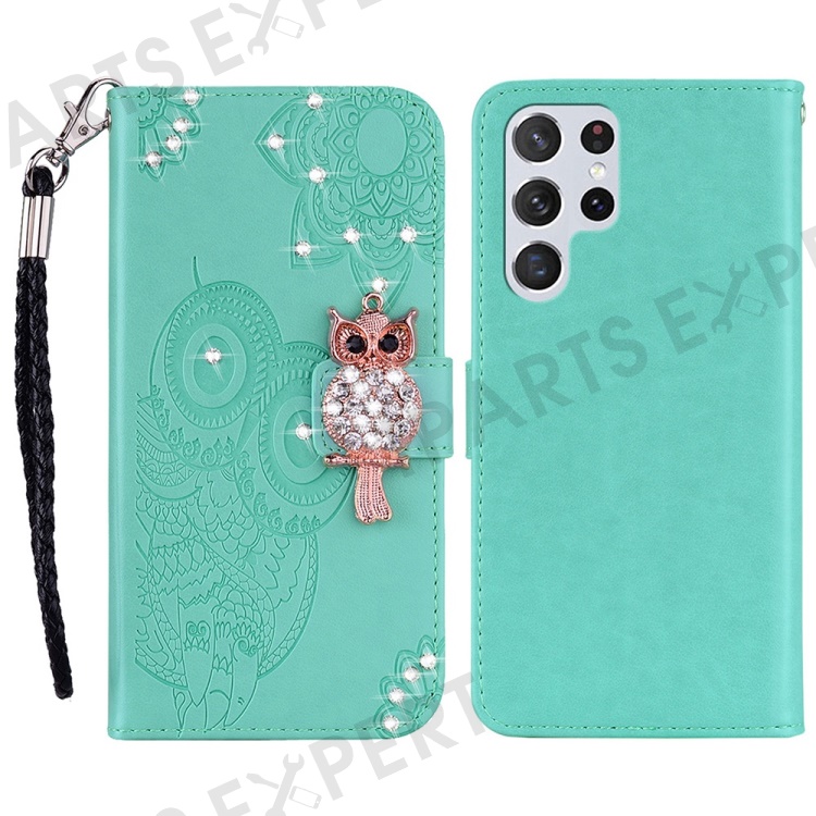 For Samsung Galaxy S23 Ultra Fall Proof Rhinestone Decor Phone Cover, Imprinting Owl Flower Pattern Stand Wallet Leather Case - Cyan