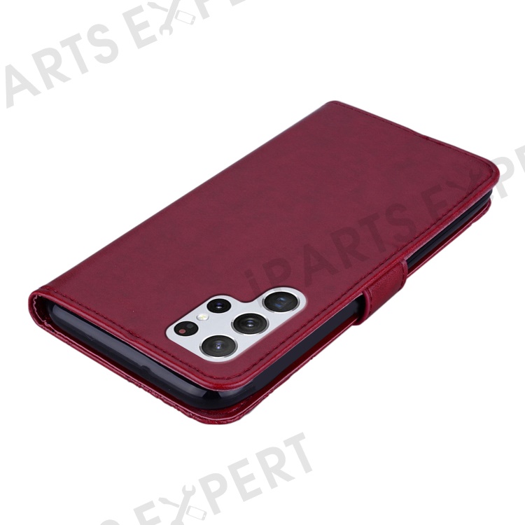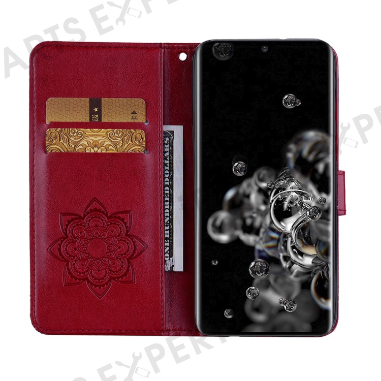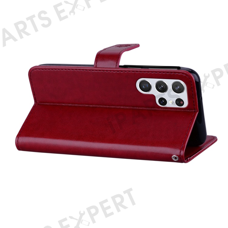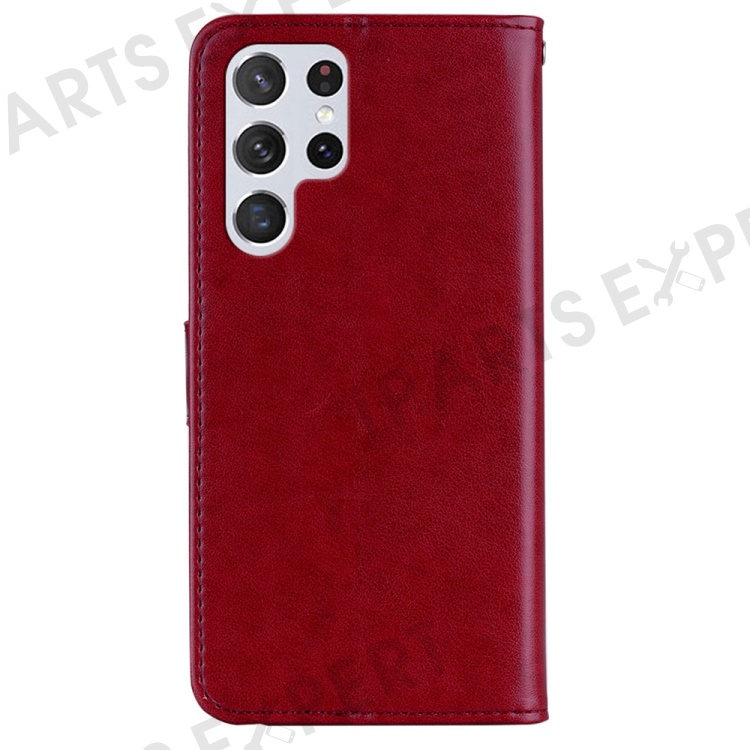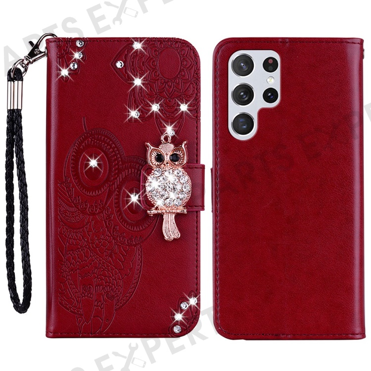 For Samsung Galaxy S23 Ultra Fall Proof Rhinestone Decor Phone Cover, Imprinting Owl Flower Pattern Stand Wallet Leather Case - Red