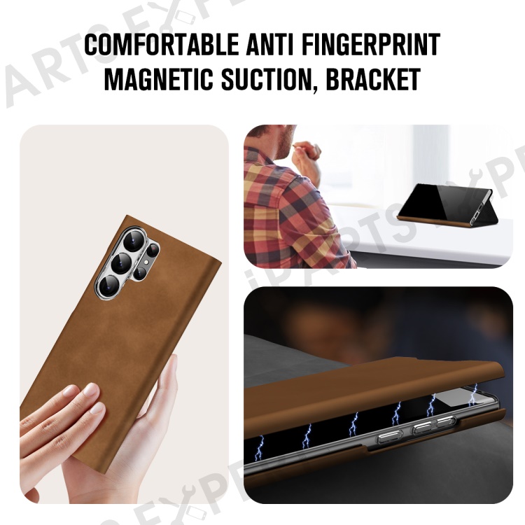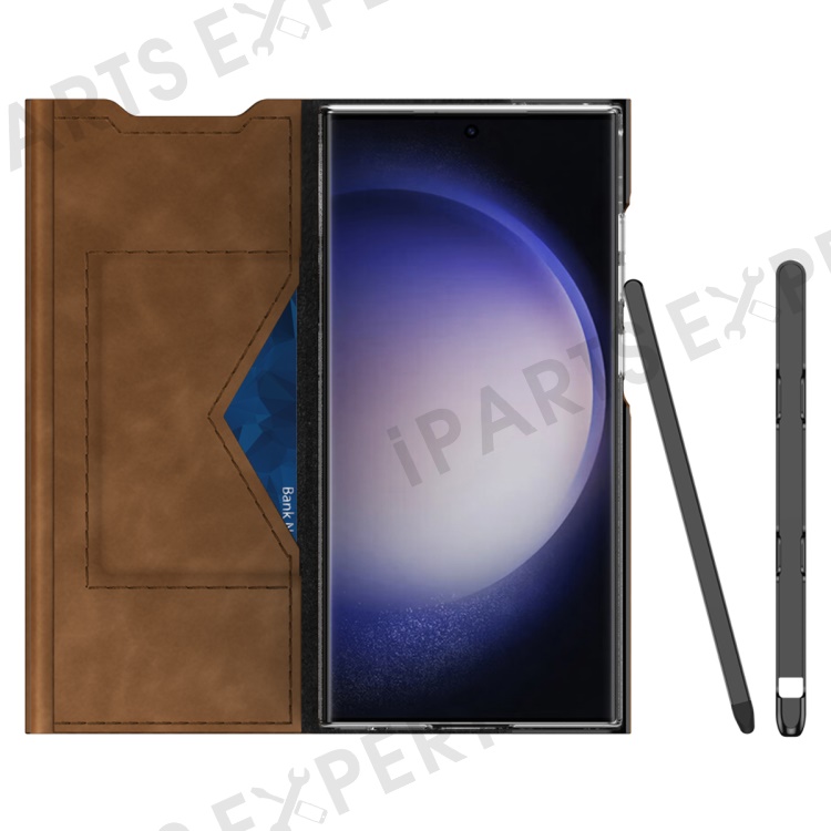 For Samsung Galaxy S23 Ultra Card Holder PU Leather + PC Phone Case Nappa Texture Stand Cover - Brown