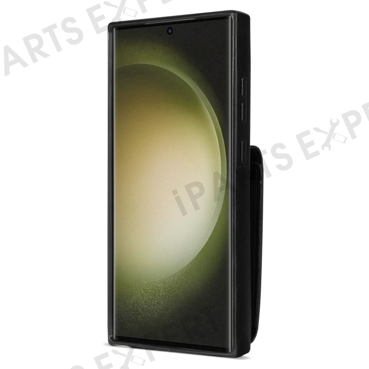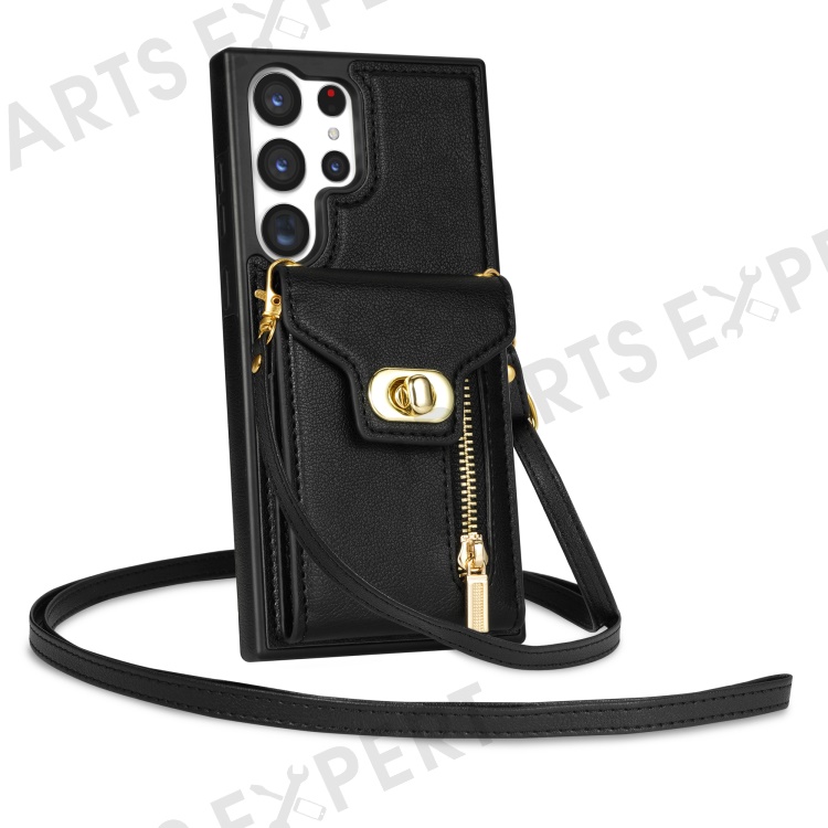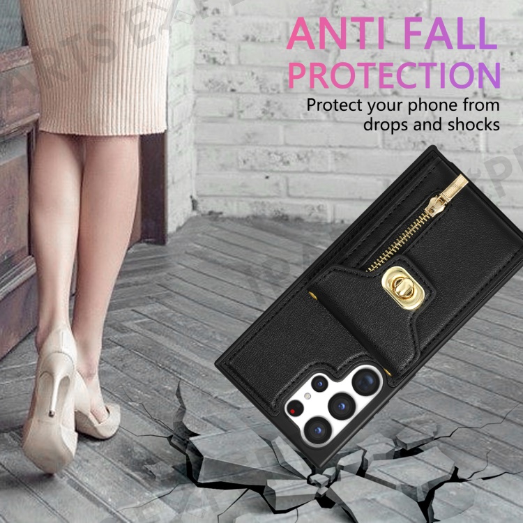 For Samsung Galaxy S23 Ultra Card Slots Phone Cover Zipper Pocket Leather Coated TPU Kickstand Case - Black