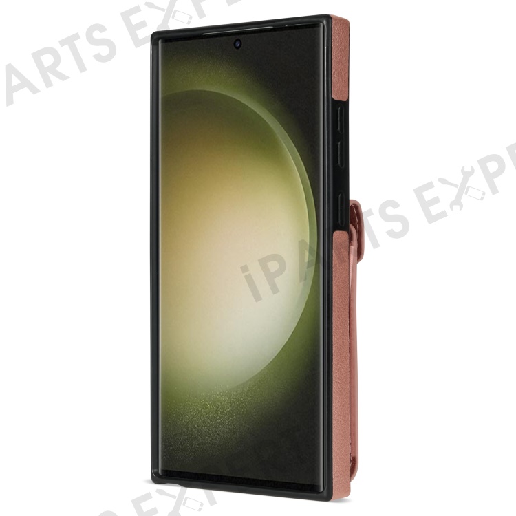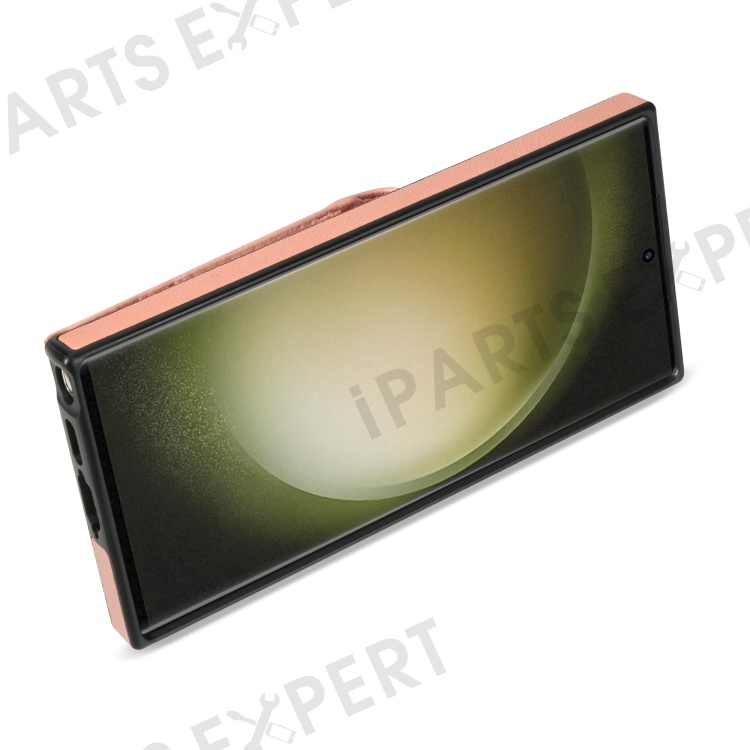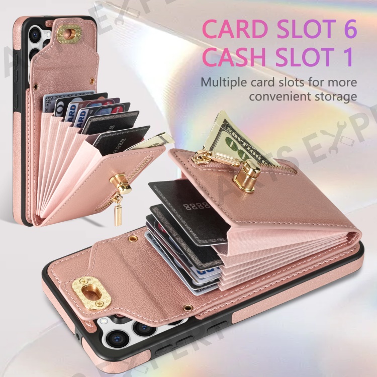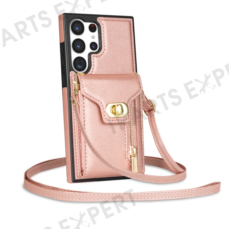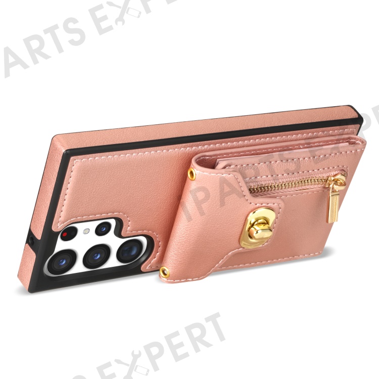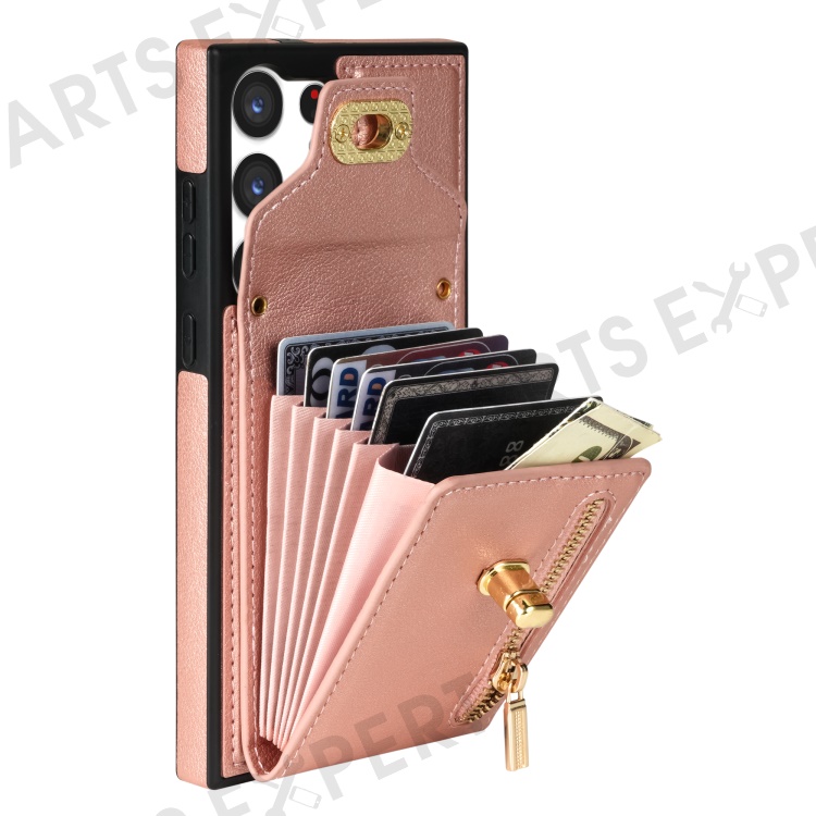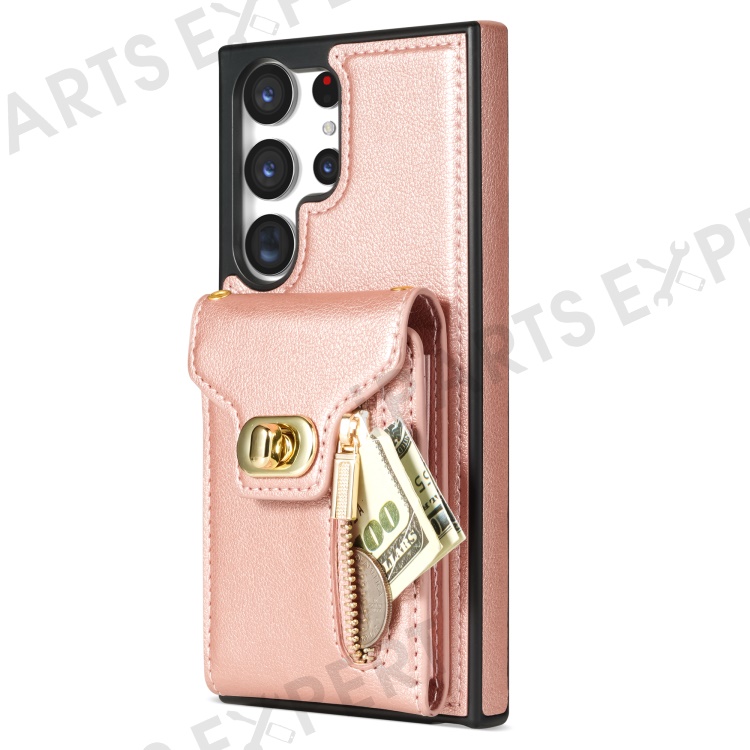 For Samsung Galaxy S23 Ultra Card Slots Phone Cover Zipper Pocket Leather Coated TPU Kickstand Case - Pink
