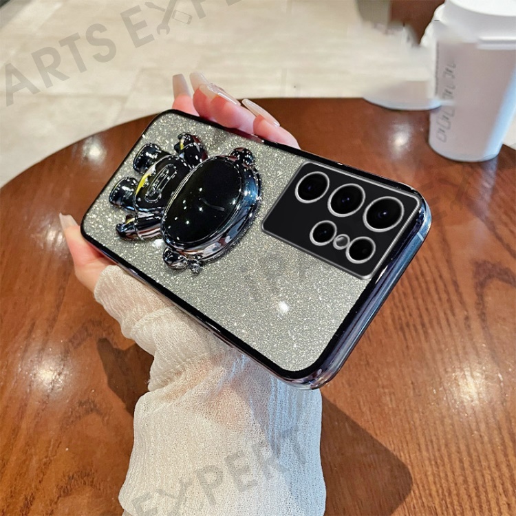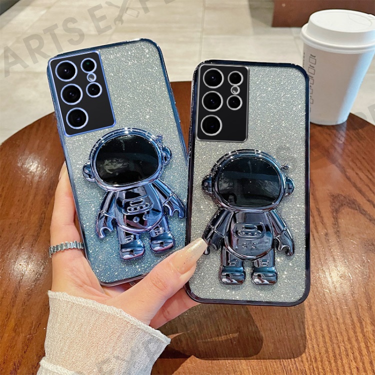 For Samsung Galaxy S23 Ultra Case Astronaut Kickstand Electroplating Glitter Cover - Black