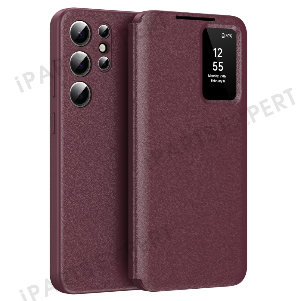 For Samsung Galaxy S23 Ultra Case Leather Phone Cover with View Window Card Slot - Wine Red