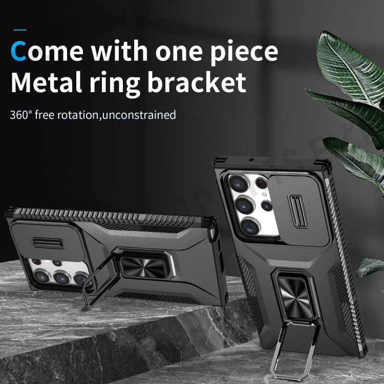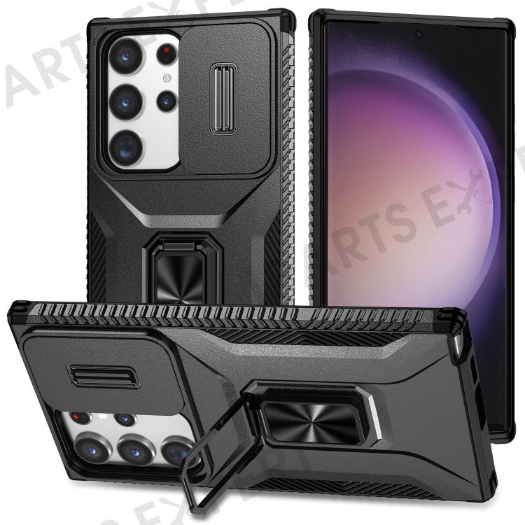 For Samsung Galaxy S23 Ultra Case Slide Lens Lid PC+TPU Phone Cover Kickstand Shell - Black