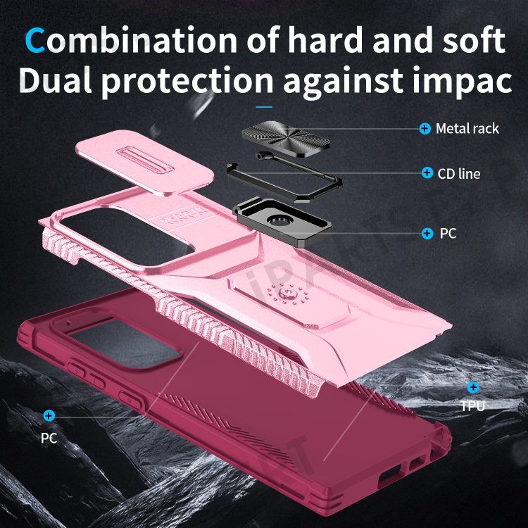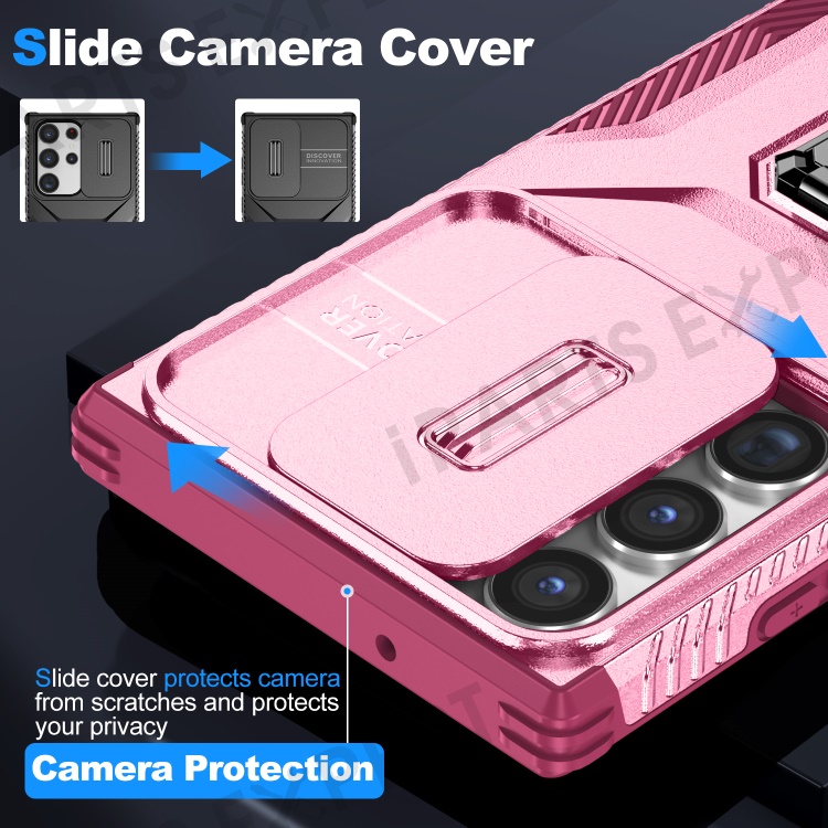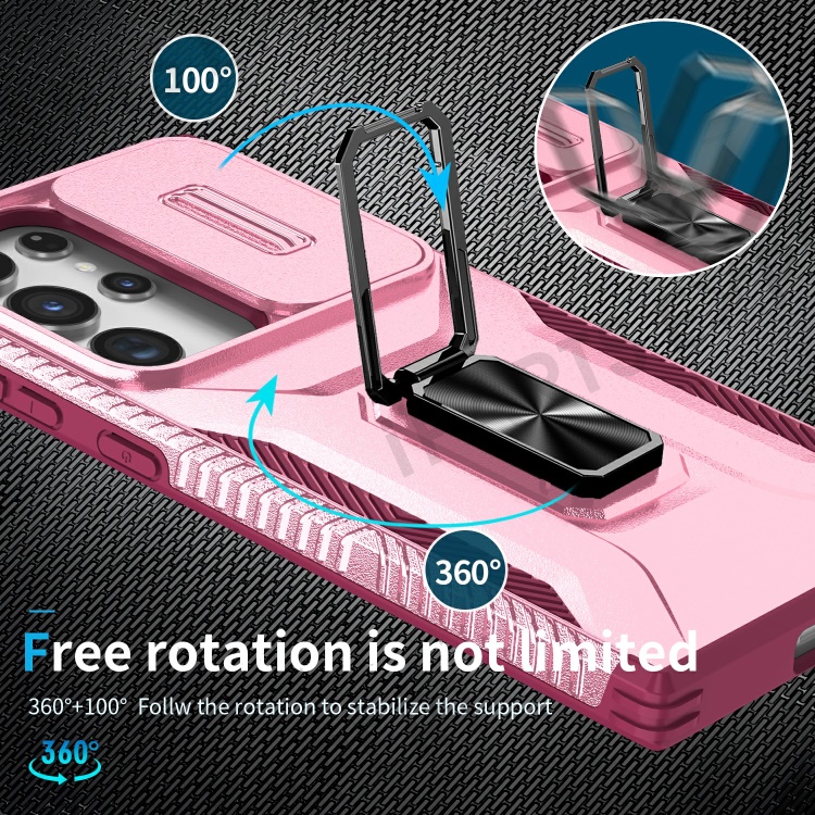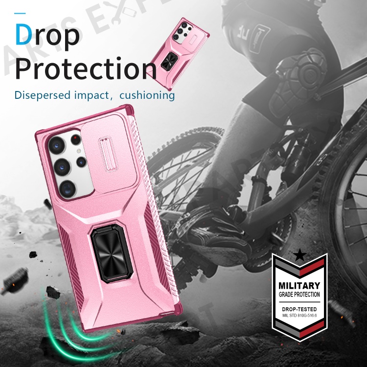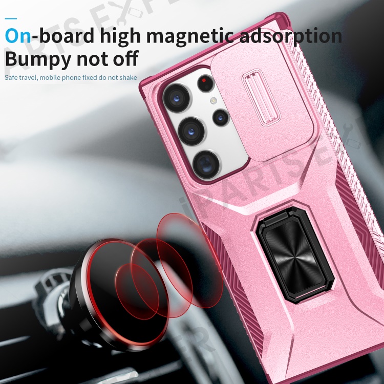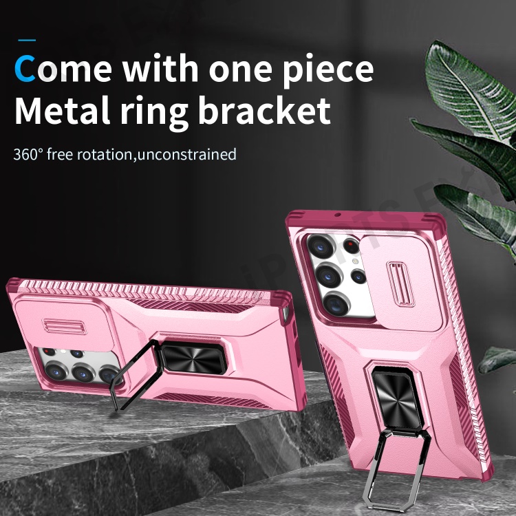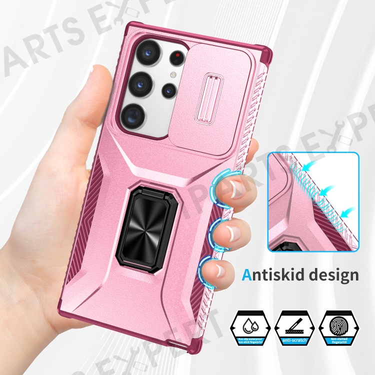 For Samsung Galaxy S23 Ultra Case Slide Lens Lid PC+TPU Phone Cover Kickstand Shell - Pink / Rose
