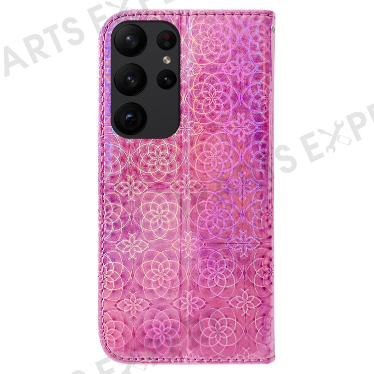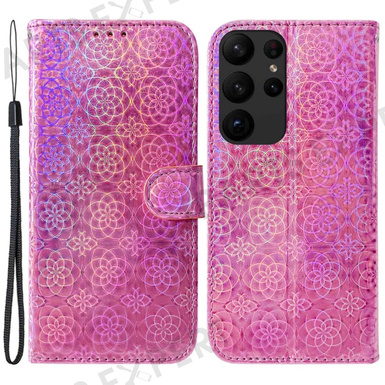 For Samsung Galaxy S23 Ultra Dazzling Flower Pattern PU Leather Case Wallet Stand Full Coverage Inner TPU Phone Cover with Strap - Pink