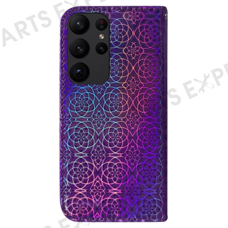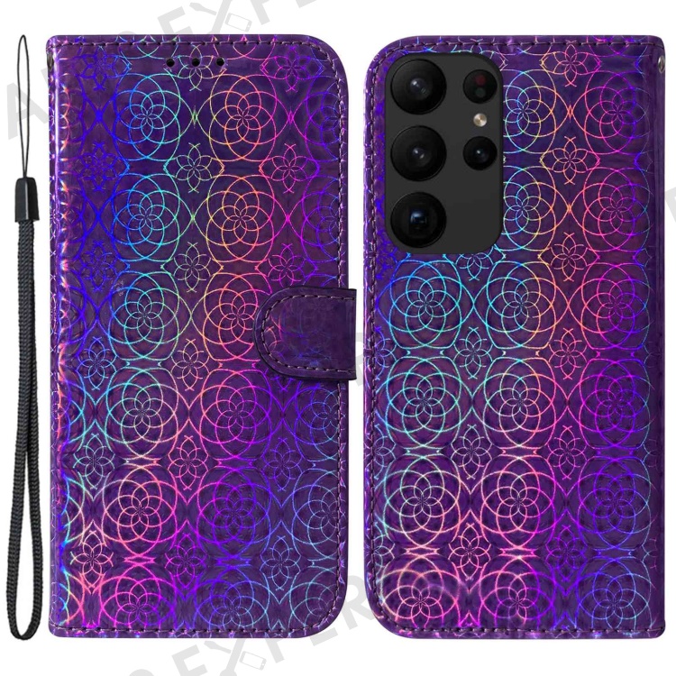 For Samsung Galaxy S23 Ultra Dazzling Flower Pattern PU Leather Case Wallet Stand Full Coverage Inner TPU Phone Cover with Strap - Purple