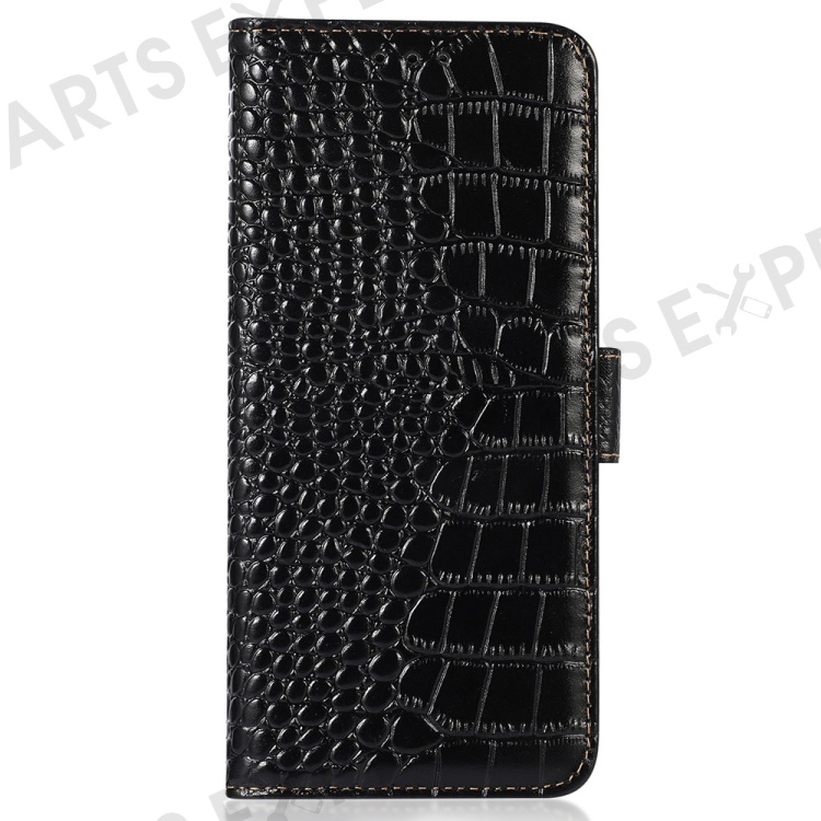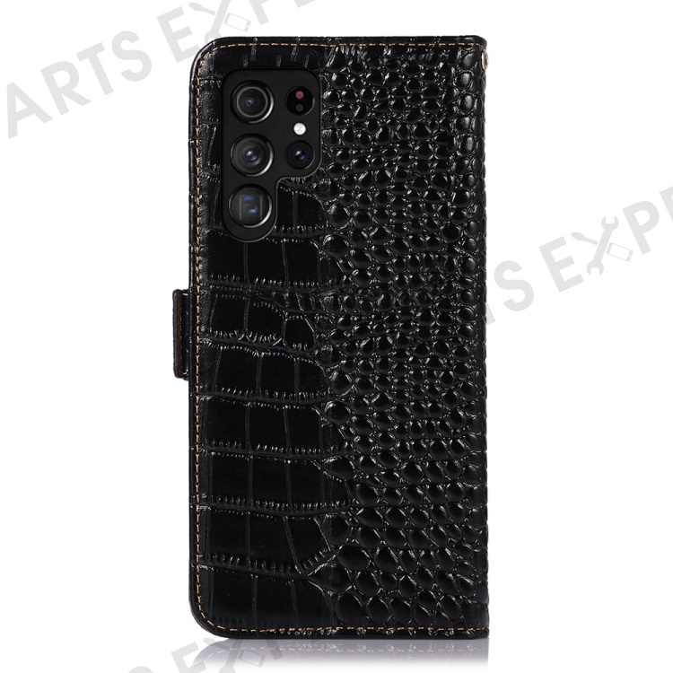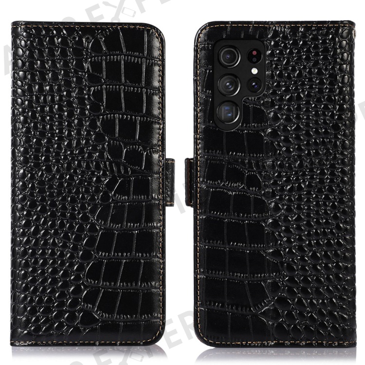 For Samsung Galaxy S23 Ultra Genuine Cowhide Leather Wallet Case Crocodile Texture RFID Blocking Stand Magnetic Flip Phone Cover - Black