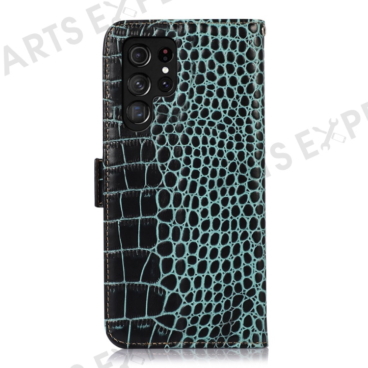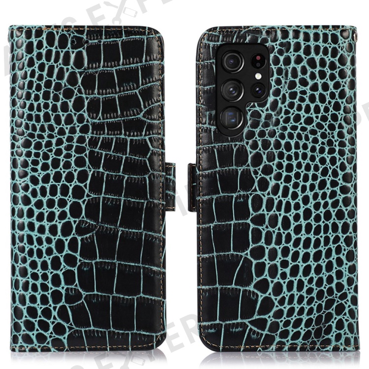 For Samsung Galaxy S23 Ultra Genuine Cowhide Leather Wallet Case Crocodile Texture RFID Blocking Stand Magnetic Flip Phone Cover - Green