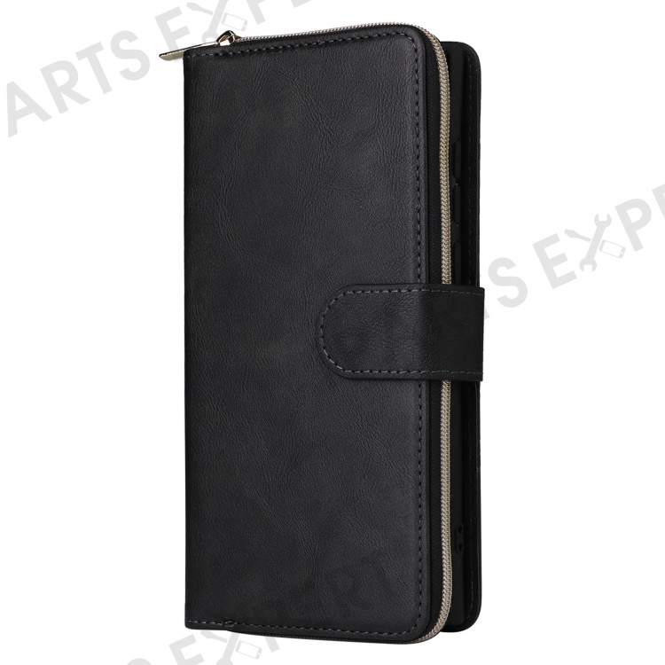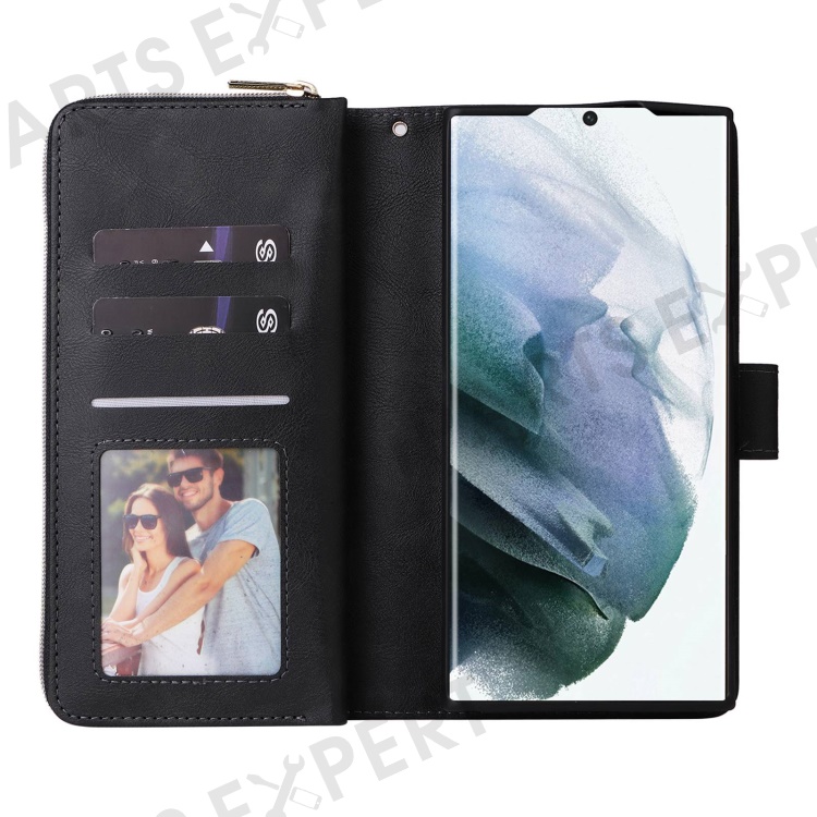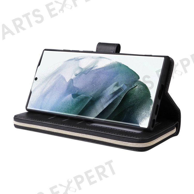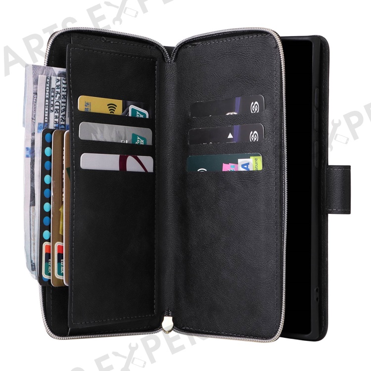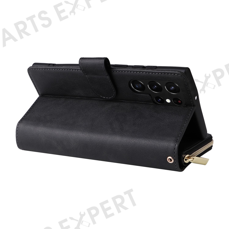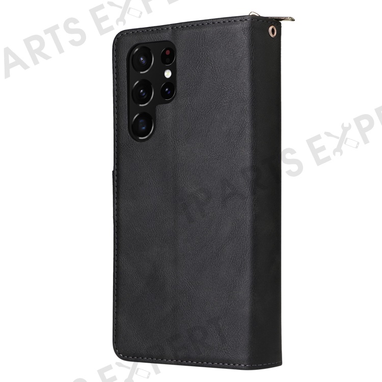 For Samsung Galaxy S23 Ultra Hands-free Stand Wallet Phone Flip Case PU Leather Magnetic 9 Card Holder Slots Zipper Pocket Cover with Strap - Black