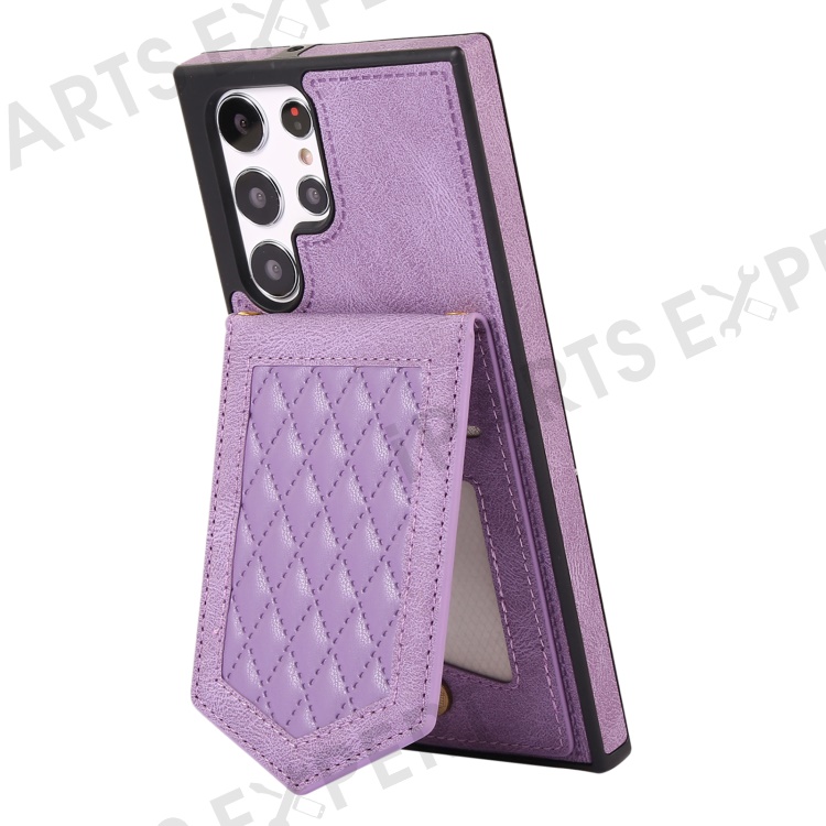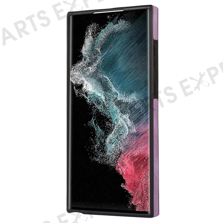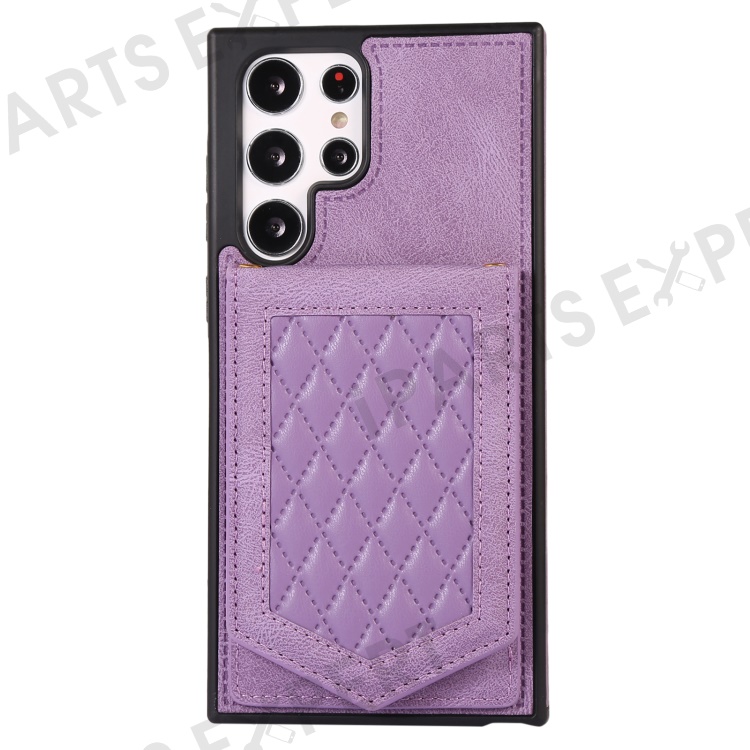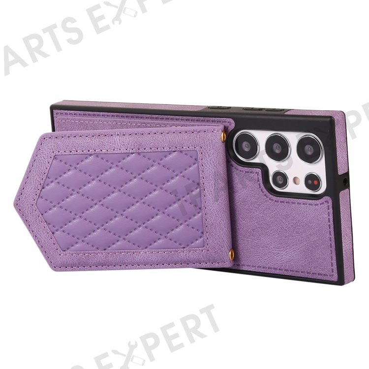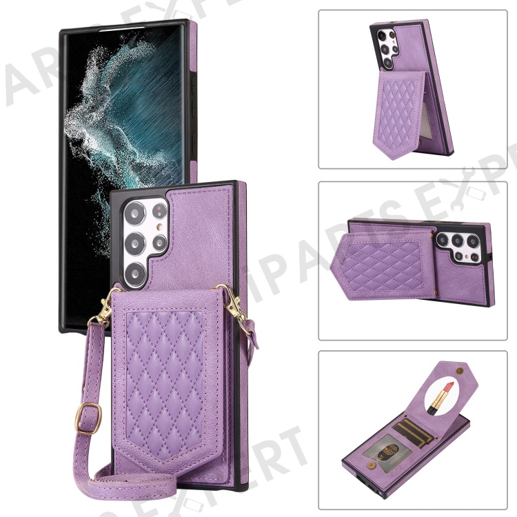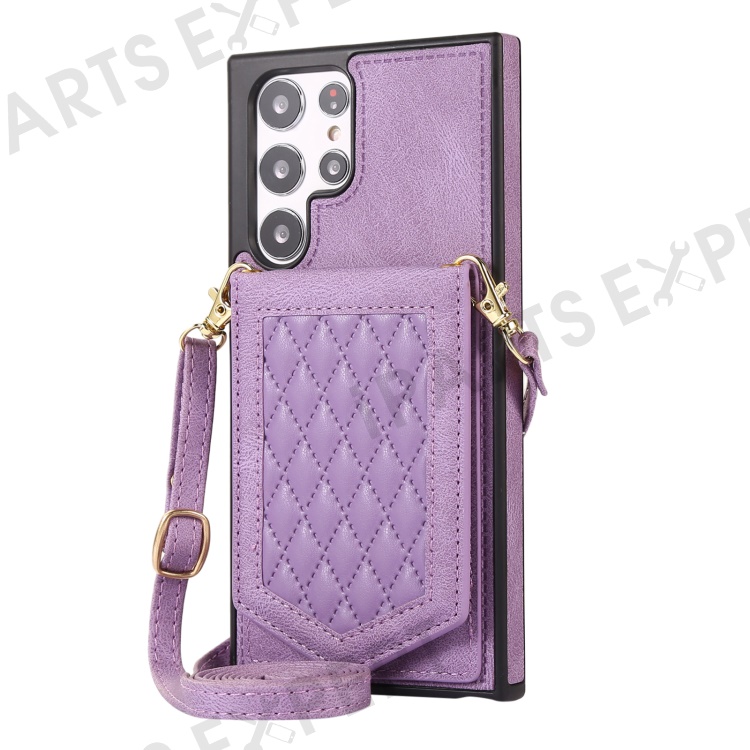 For Samsung Galaxy S23 Ultra Imprinted PU Leather Coated TPU Kickstand Case Anti-drop RFID Blocking Card Holder Phone Cover with Shoulder Strap - Purple